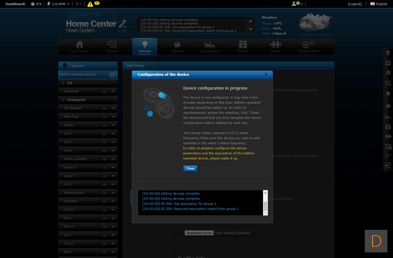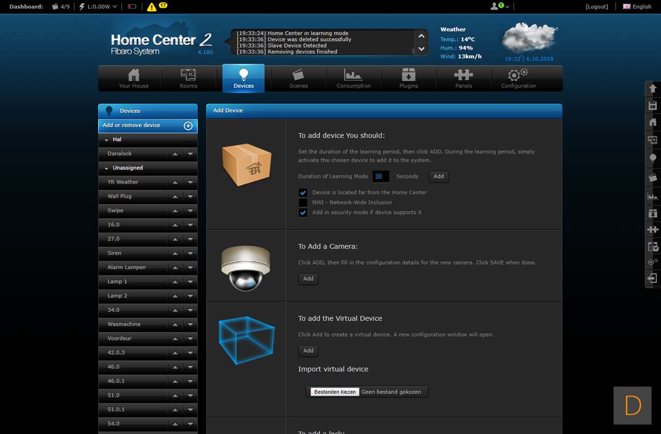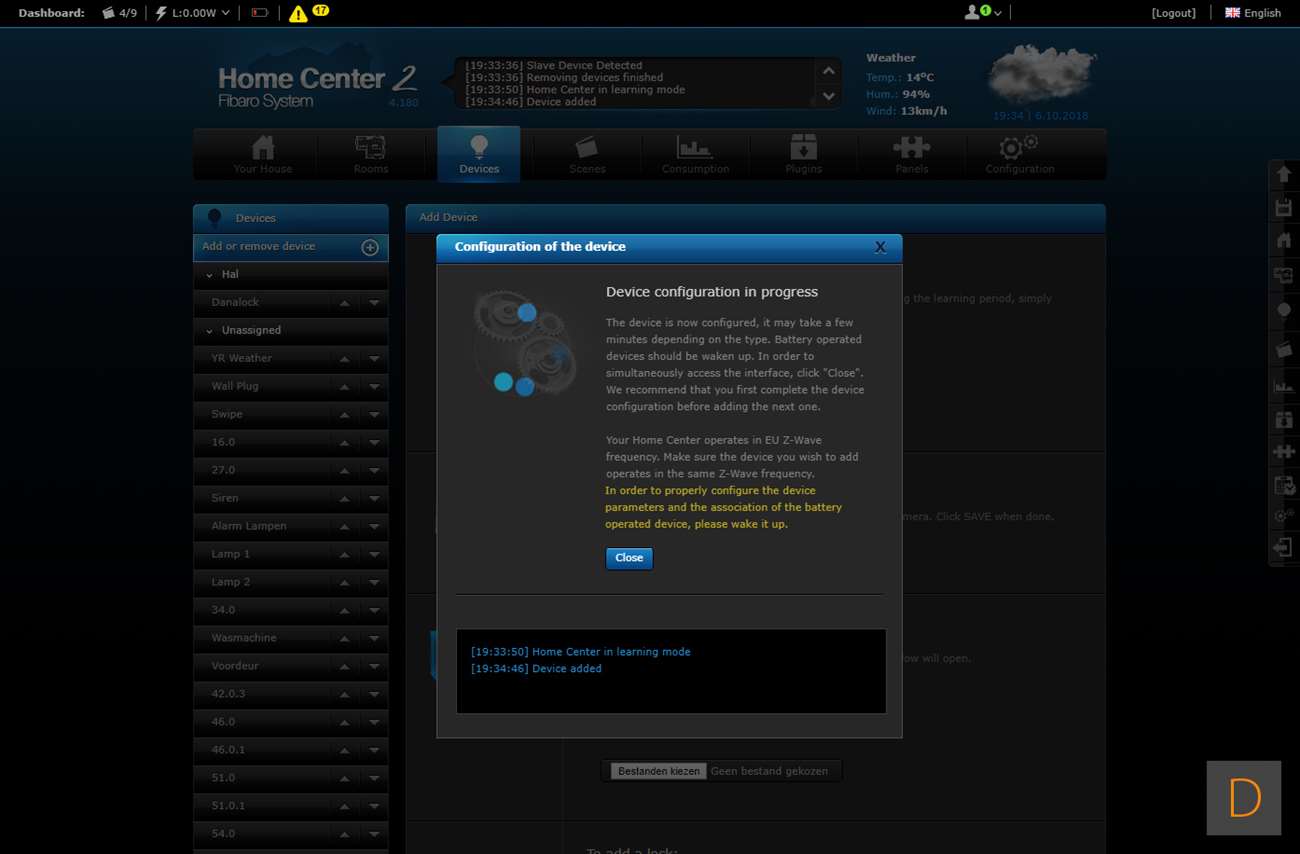 De volgende controller is de HC2 van Fibaro. Het toevoegen gaat weer door de controller in de "toevoegen" stand te zetten en de magneet te verwijderen bij de sensor. Hij zal dan automatisch gevonden worden. Mocht dit niet het geval zijn dan moet je de magneet 3x heen en weer bewegen over de sensor. Mocht het toevoegen niet gelukt zijn dan zal de LED 5x gaan knipperen. Hij werd hierna toegevoegd aan de HC2. Het valt mij op dat er gemeld wordt dat er nog geen template beschikbaar is. Ondanks dit, zie ik netjes op het dashboard een LUX meter, temperatuurmeter, het water lekkage niveau en het batterijniveau.