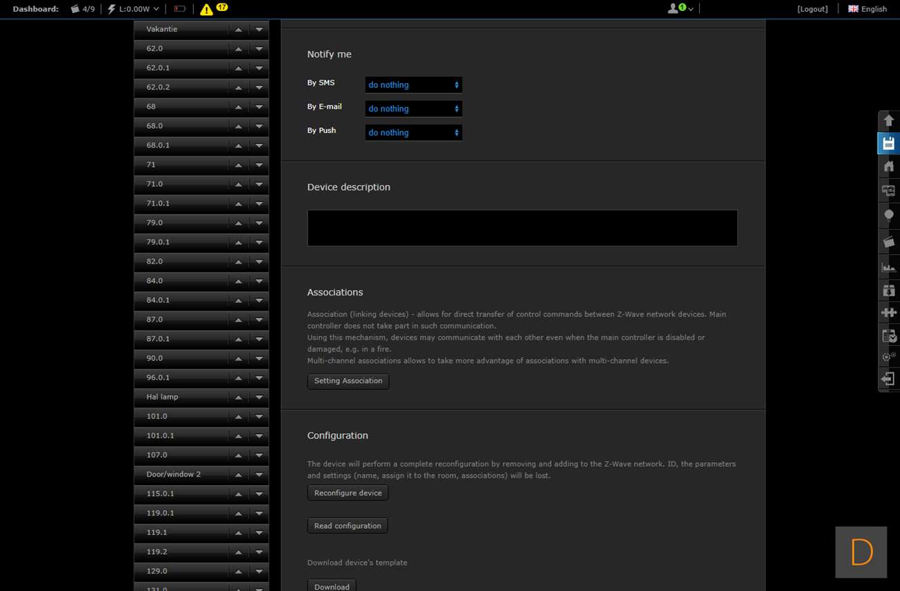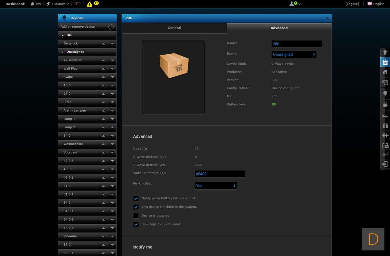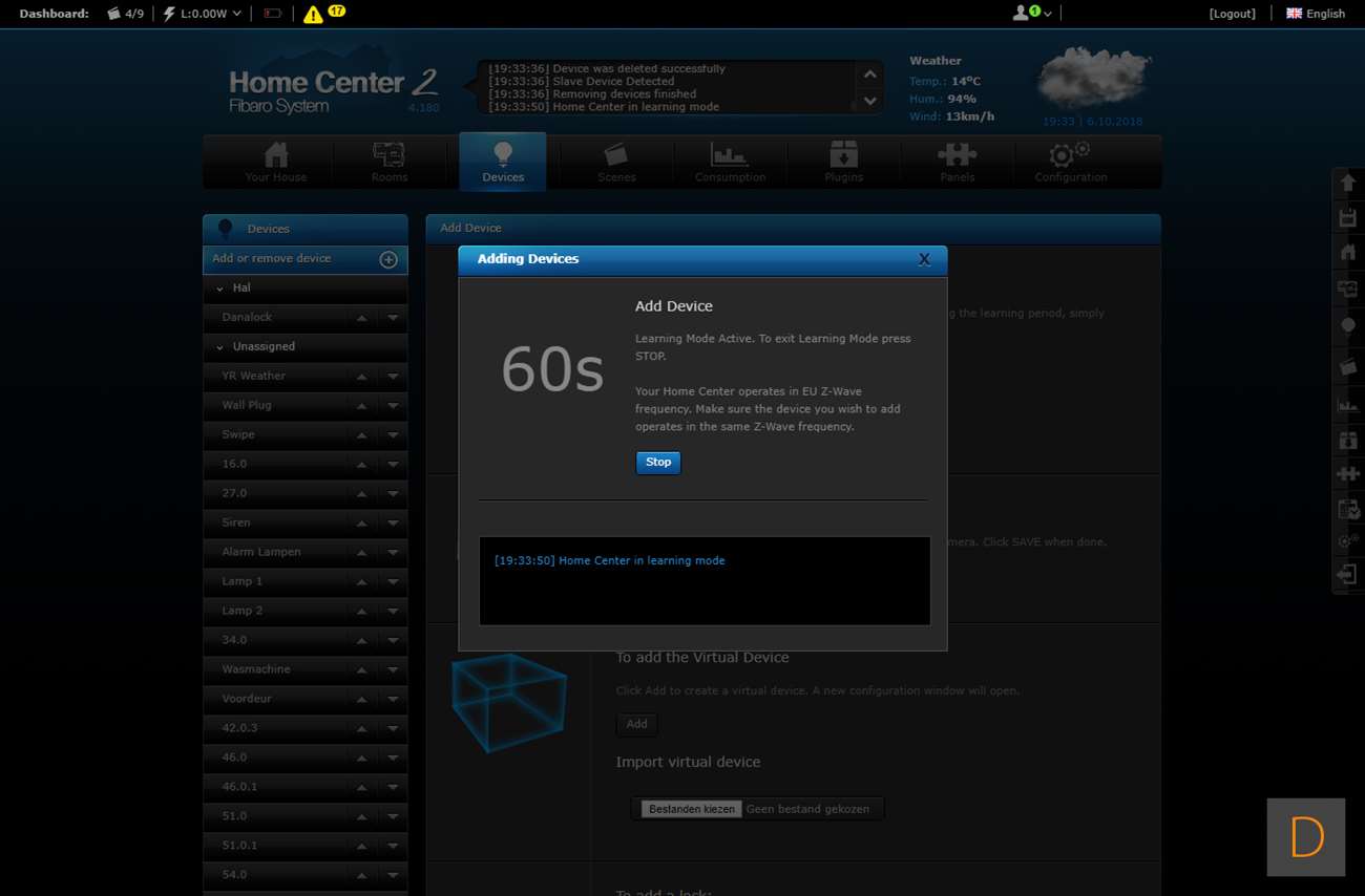 De volgende controller is de HC2 van Fibaro. Het toevoegen gaat weer door de controller in de "toevoegen" stand te zetten en de magneet te verwijderen bij de sensor. Hij zal dan automatisch gevonden worden. Mocht dit niet het geval zijn dan moet je de magneet 3x heen en weer bewegen over de sensor. Mocht het toevoegen niet gelukt zijn dan zal de LED 5x gaan knipperen. Hij werd hierna toegevoegd aan de HC2. Het valt mij op dat er gemeld wordt dat er nog geen template beschikbaar is. Ondanks dit, zie ik netjes op het dashboard een LUX meter, temperatuurmeter, het water lekkage niveau en het batterijniveau.