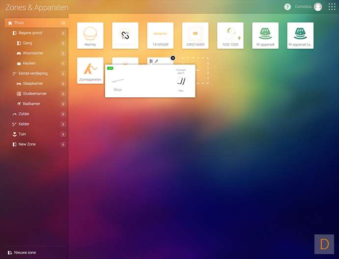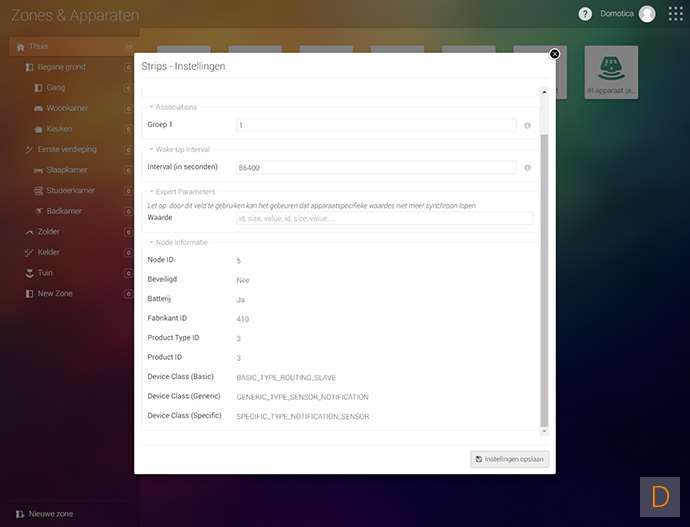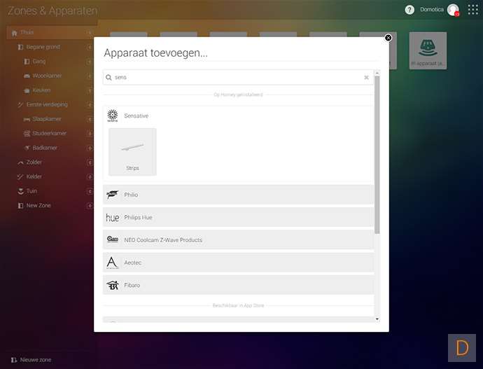 Het toevoegen van deze strip kun je doen door naar het apparaten gedeelte te gaan en te klikken op de + knop. Vervolgens zoek je de sensative strip op en installeer je de APP, mocht je dit nog niet gedaan hebben.