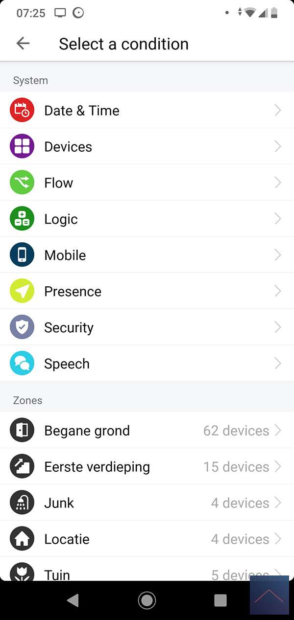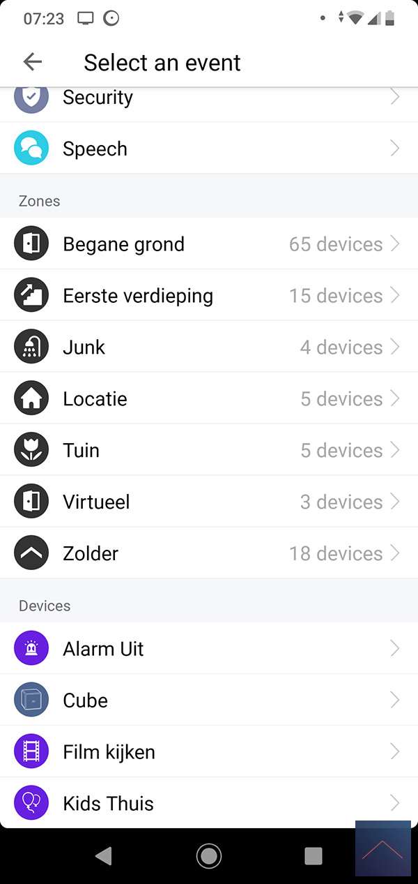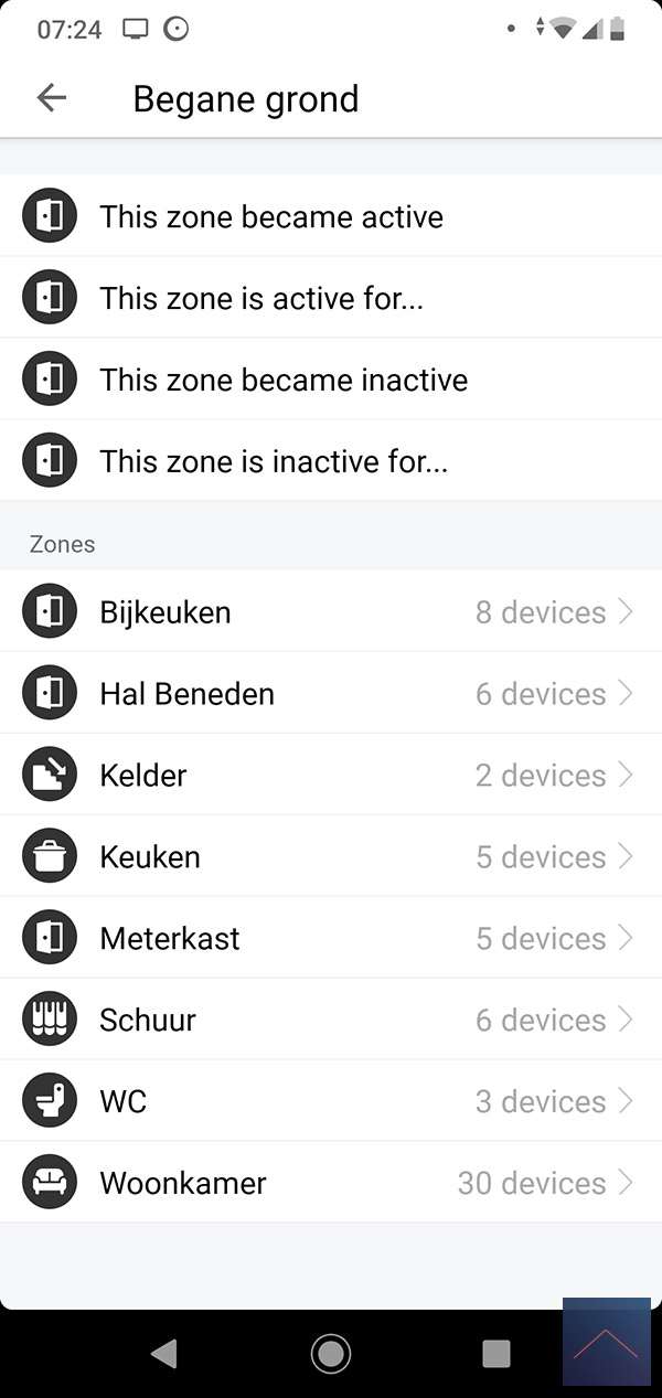 Het lijkt mij wel gaaf om te zorgen dat als er al beweging is in een bepaalde ruimte, en mijn lux meter een bepaalde waarde geeft, dat dan de Shelly wordt aangezet. Als trigger gaan we de zone actief events gebruiken. We selecteren hier de begane grond en "als de zone actief is".