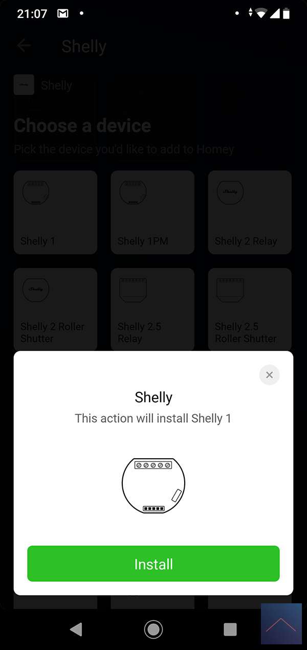 Als je alles hebt aangesloten en van stroom hebt voorzien gaan we eerst de Shelly APP installeren en de Shelly 1 toevoegen. Zie hiervoor dit artikel. Als alles werkt loggen we in op de Homey en gaan we naar je apparaten en drukken op het plusje. Vervolgens zoek je op Shelly en druk je op de Shelly 1. De APP zal hierna geinstalleerd worden (mocht je deze niet hebben).