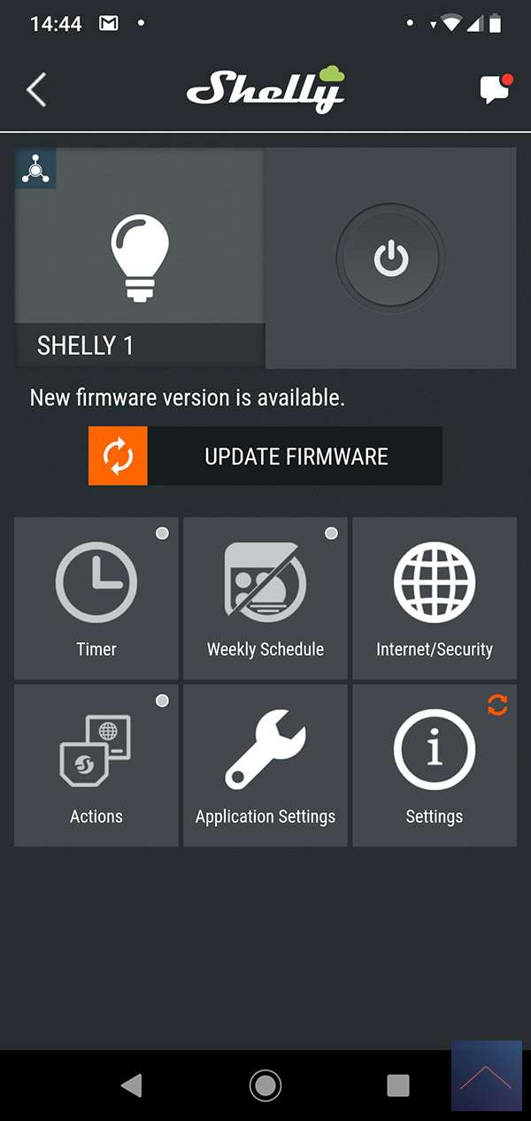 Na deze, niet geheel probleemloze, installatie kon ik de Shelly 1 bedienen. Ik zag dat er een nieuwe firmware beschikbaar was dus deze heb ik direct ingestalleerd. Hierbij moet je zorgen dat de schakelaar altijd stroom blijft houden. Na 5 min. gewacht te hebben kon ik nog steeds niet verbinden, waarna ik de stroom er af hebt gehaald om hem opnieuw op te starten. Hierna was het weer mogelijk om hem te bedienen.