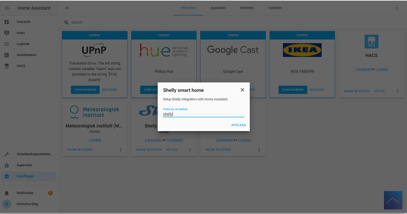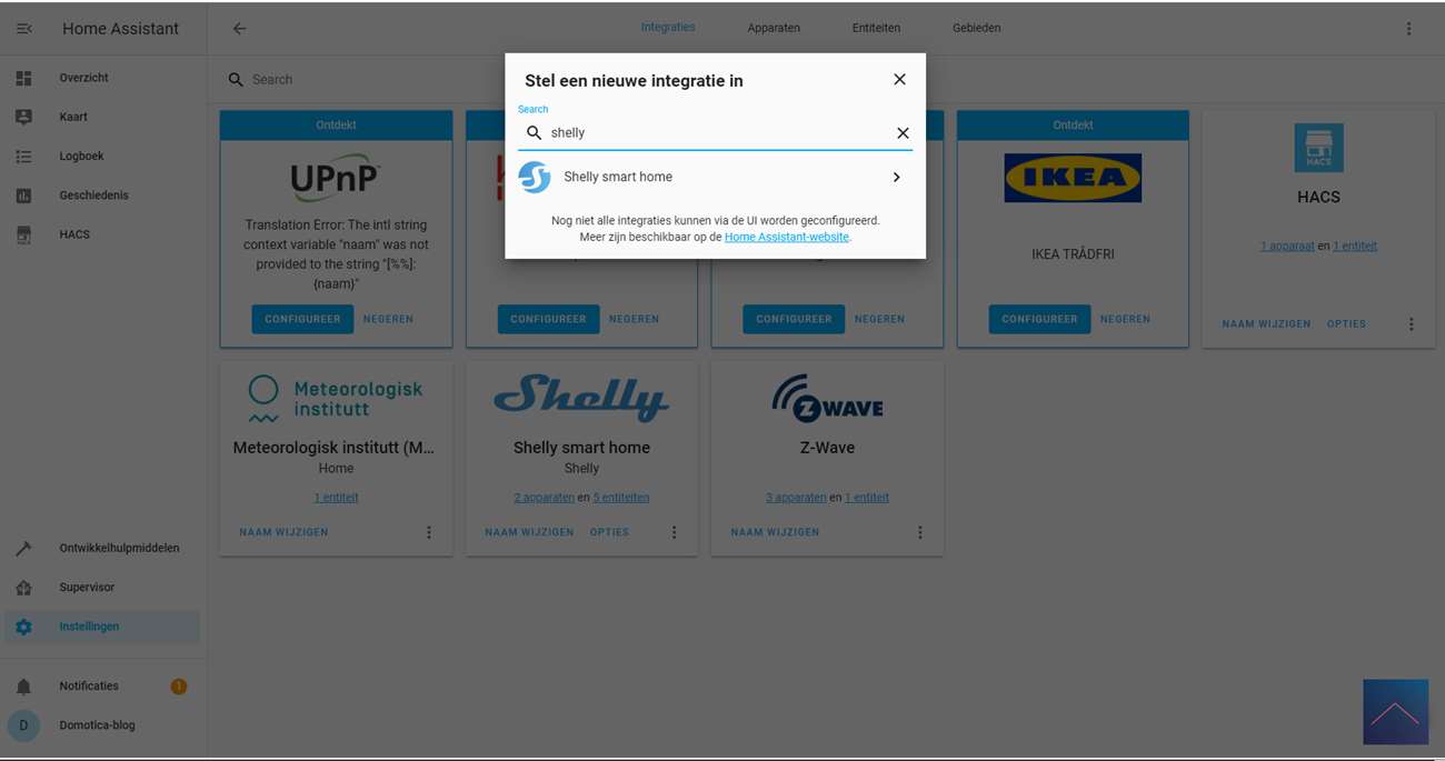 Vervolgens ga ik in HASS naar: instellingen > integraties en klik op het plusje en zoek op shelly en volg de stappen.