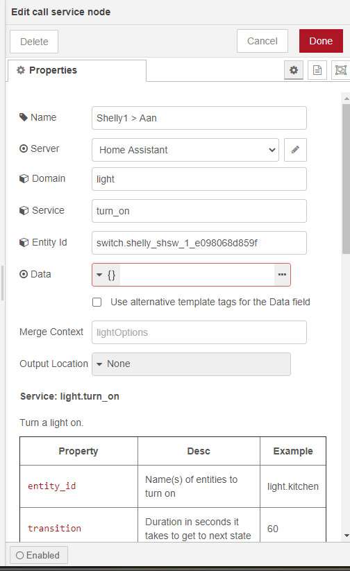Om de Shelly 1 aan te zetten gebruiken we de "call service node" en geven het volgende op: