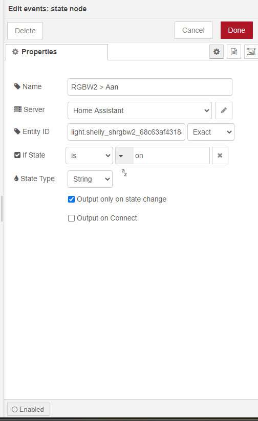 We willen dat als de Shelly RGBW2 wordt aangezet dat dan ook de Shelly1 aan gaat. We beginnen met de eventstate flow en geven als ID de shelly op en bij de IF = on.