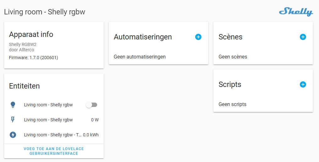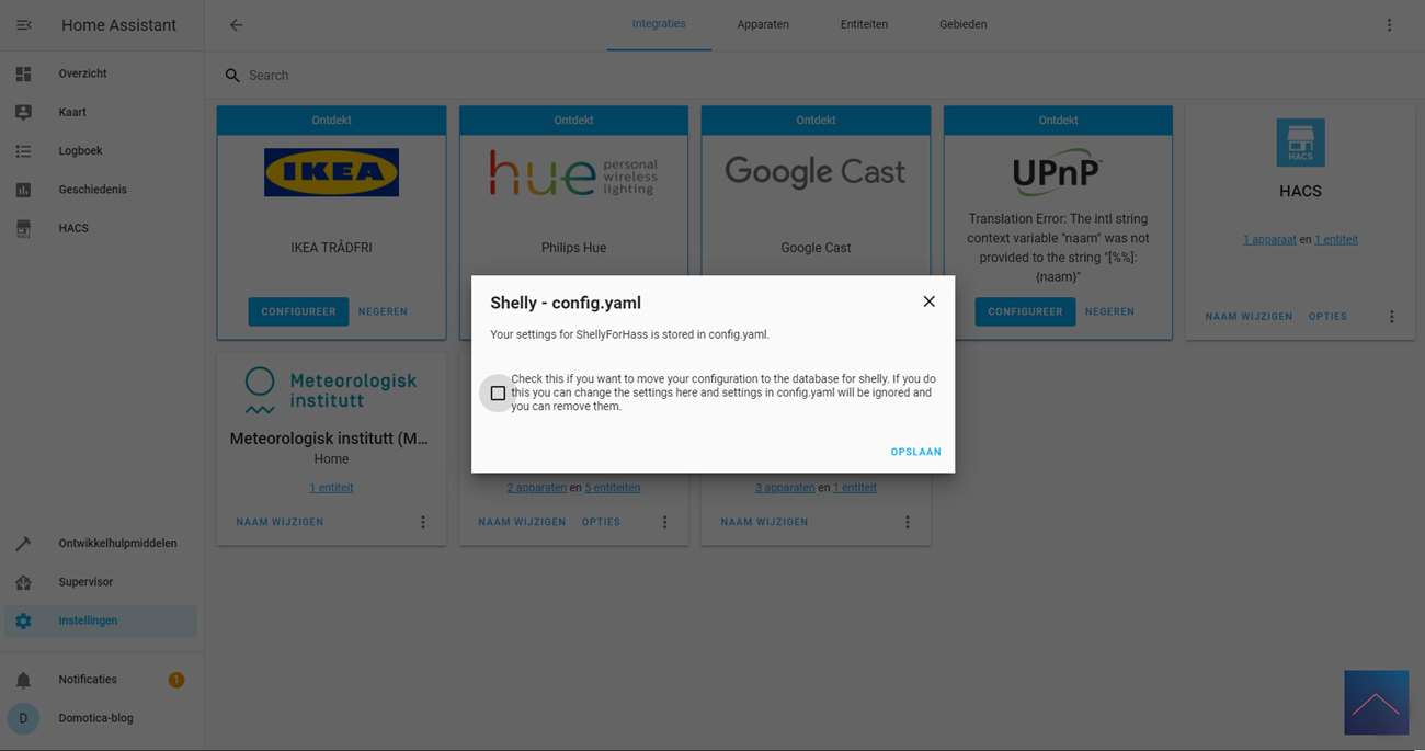 Nu moeten we alleen nog zorgen dat hij op het dashboard getoond wordt en te gebruiken is in HASS. Dit kun je regelen door naar het overzicht te gaan en op de 3 puntjes rechtsboven te klikken en vervolgens op configuratie. Hier zie je dan de Shelly tussen staan en kun je hem vervolgens toevoegen.