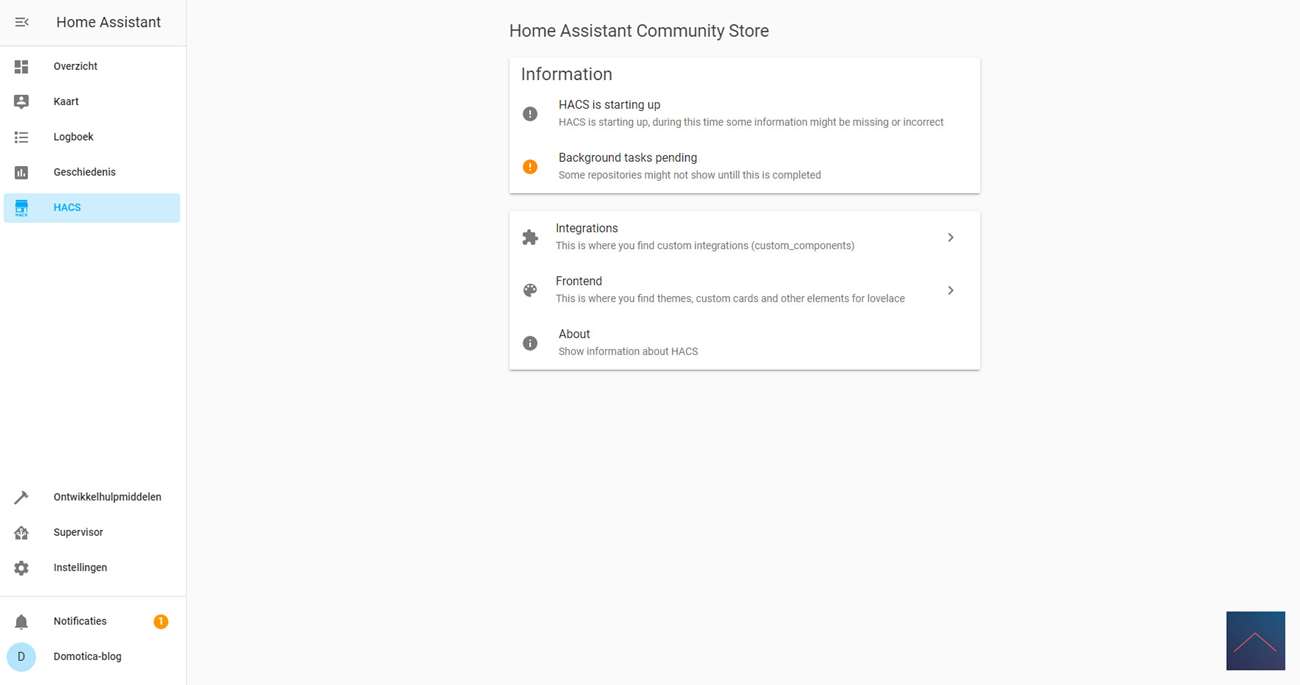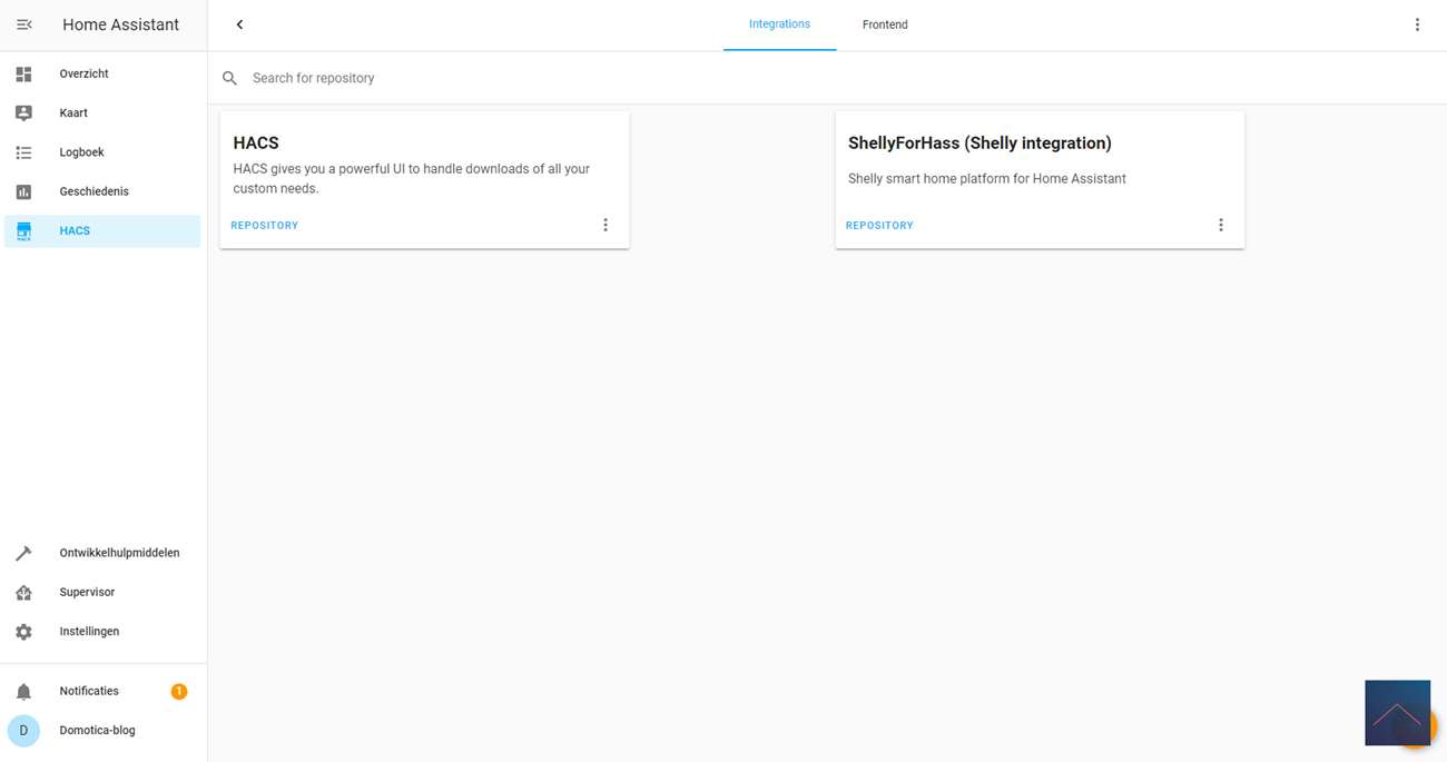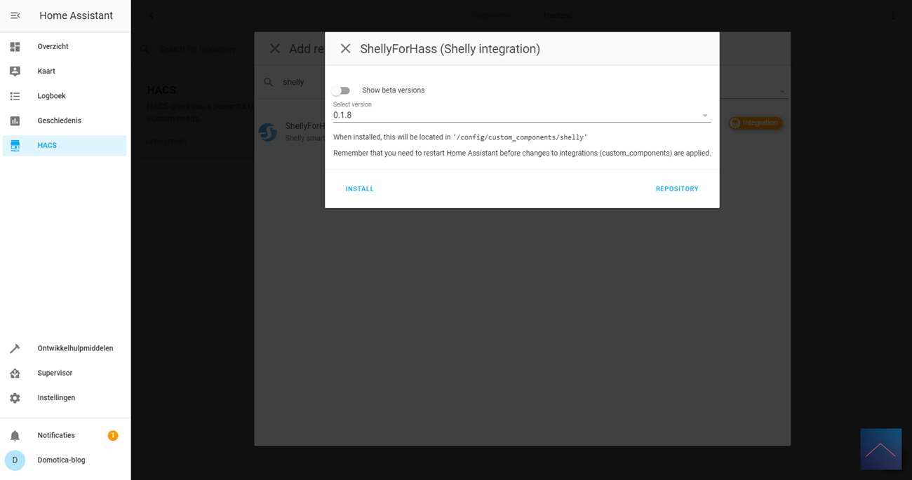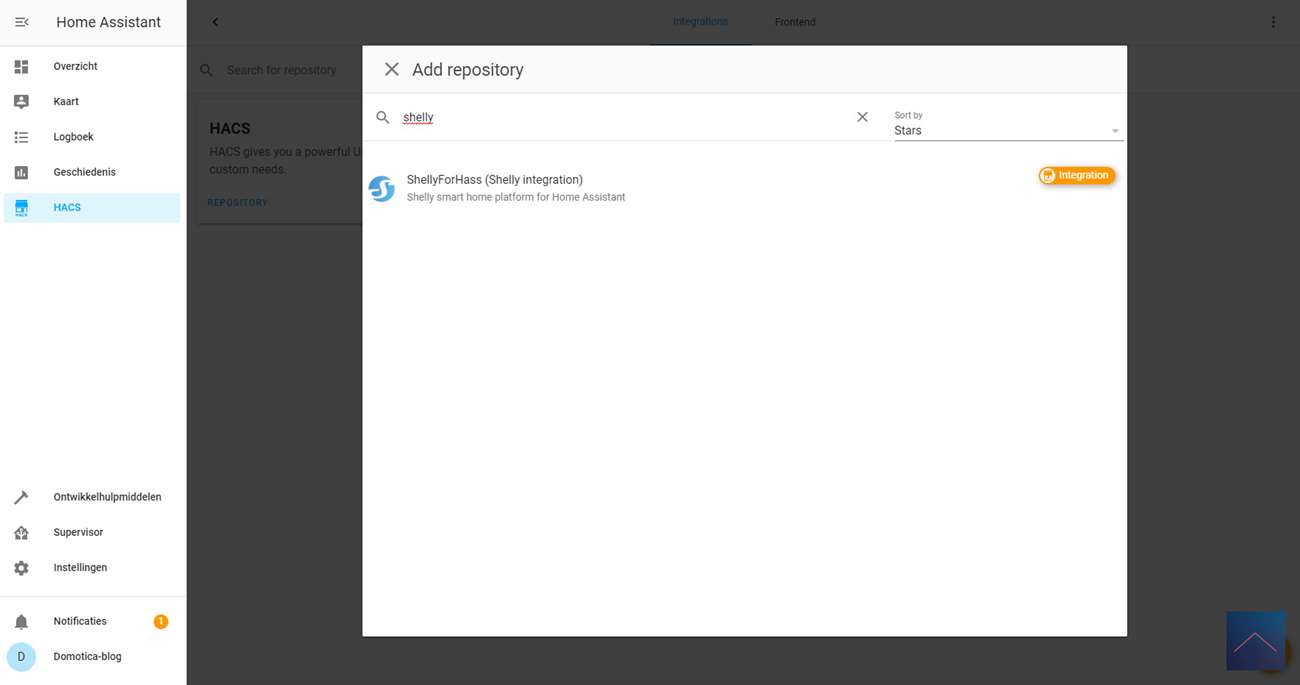 Ik ga gebruiken maken van een add-on welke je via een omweg kunt installeren. De eerste stap is om HACS (Home Assistant Community Store) je installeren. Via deze weg kun je namelijk ShellyForHass installeren.