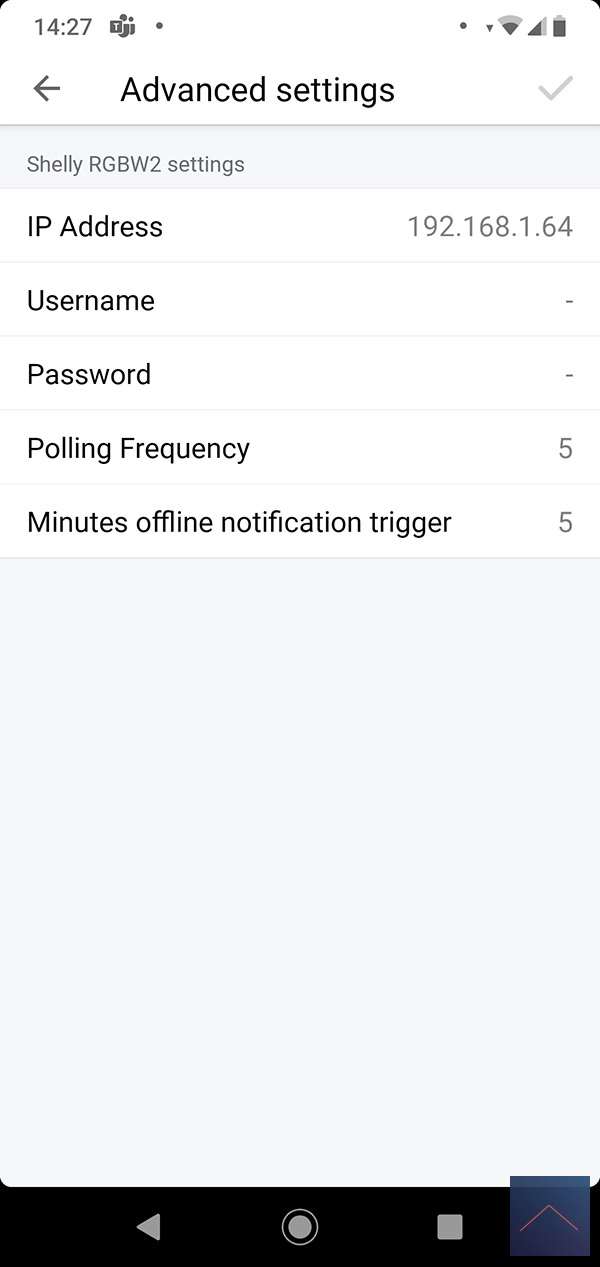 Je kunt eventueel een login en wachtwoord op je Shelly zetten, deze is in te voeren bij configuratie. Je vindt hier ook een polling frequentie, er wordt aanbevolen deze niet lager te zetten van 5. Daarnaast kun je instellen dat je een notificatie wilt ontvangen als de Shelly een x aantal minuten niet reageert.