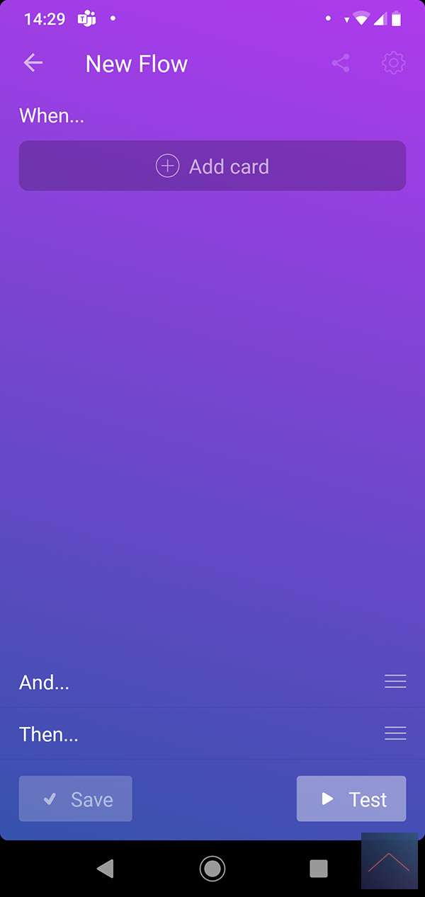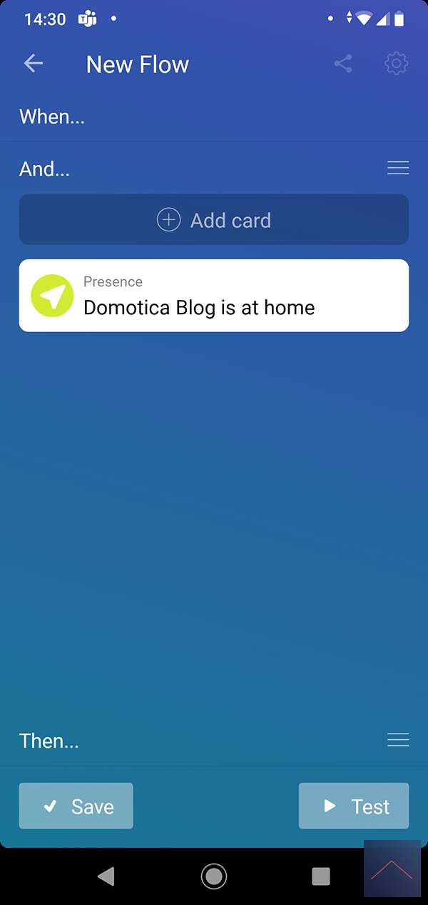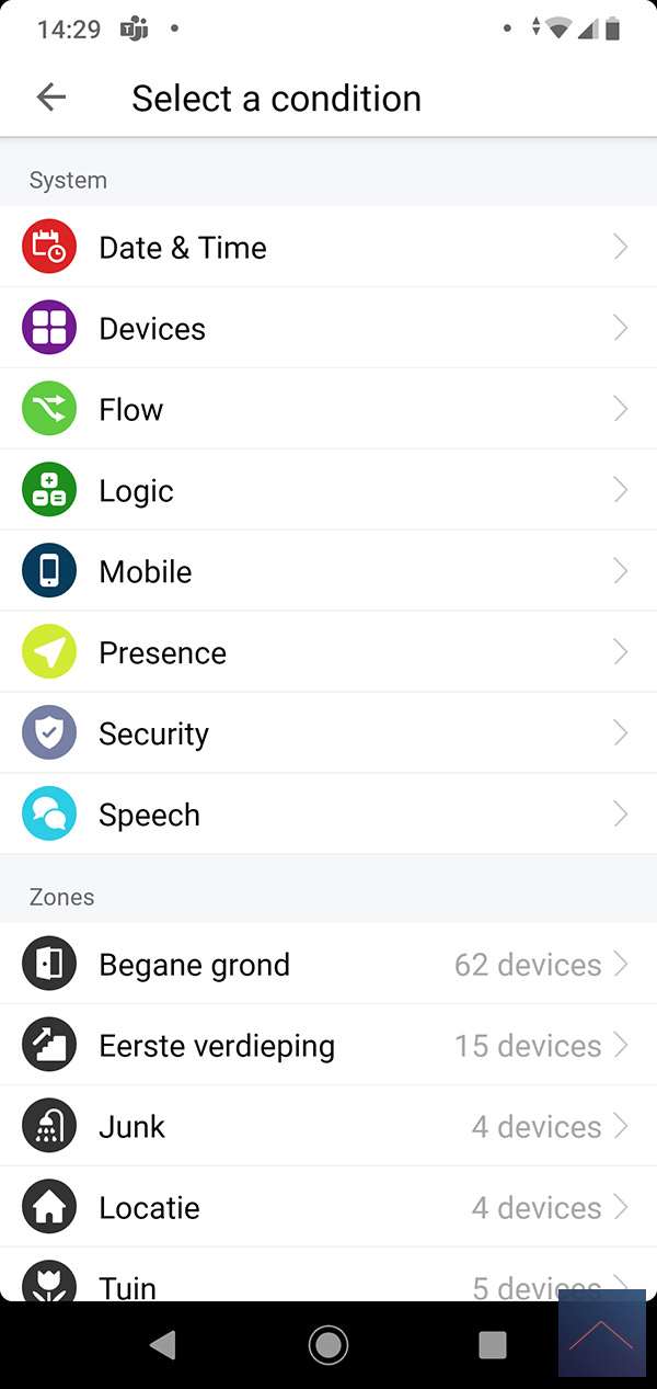 Om een flow te maken krijg je verschillende opties tot je beschikking. Complimenten aan de ontwikkelaar want dit is perfect geïntegreerd in de Homey.