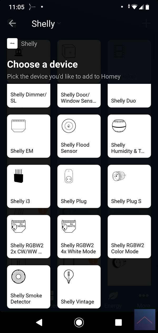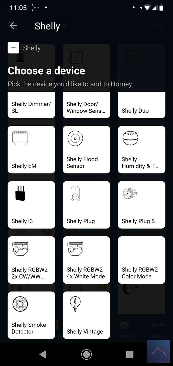 Als alles goed werkt in de Shelly APP gaan we hem toevoegen aan de Homey. Ga naar je apparaten in de APP en druk op het plusje. Zoek vervolgens op Shelly en start de installatie. De APP zal eerst geinstalleerd worden (mocht je deze nog niet hebben). De Homey zal hierna je netwerk af zoeken om te zien of hij de Shelly kan vinden. In mijn geval werd hij snel gevonden en ik zie ook het juiste ip-adres staan, dus ik kan verder gaan met de installatie.