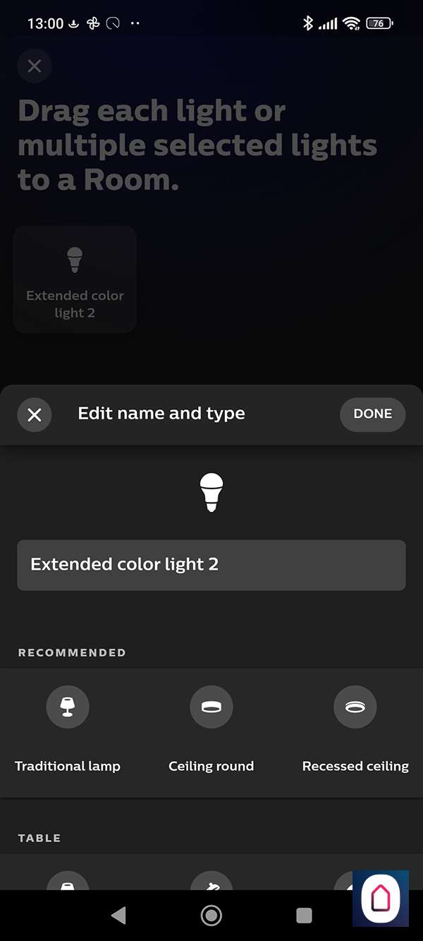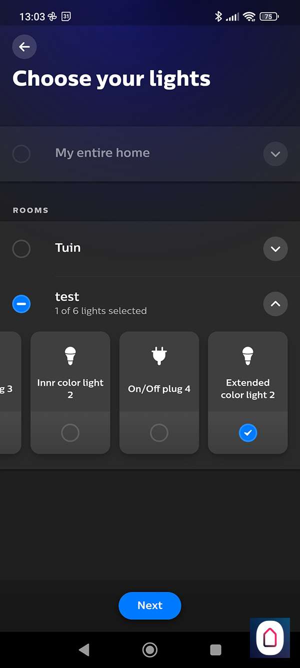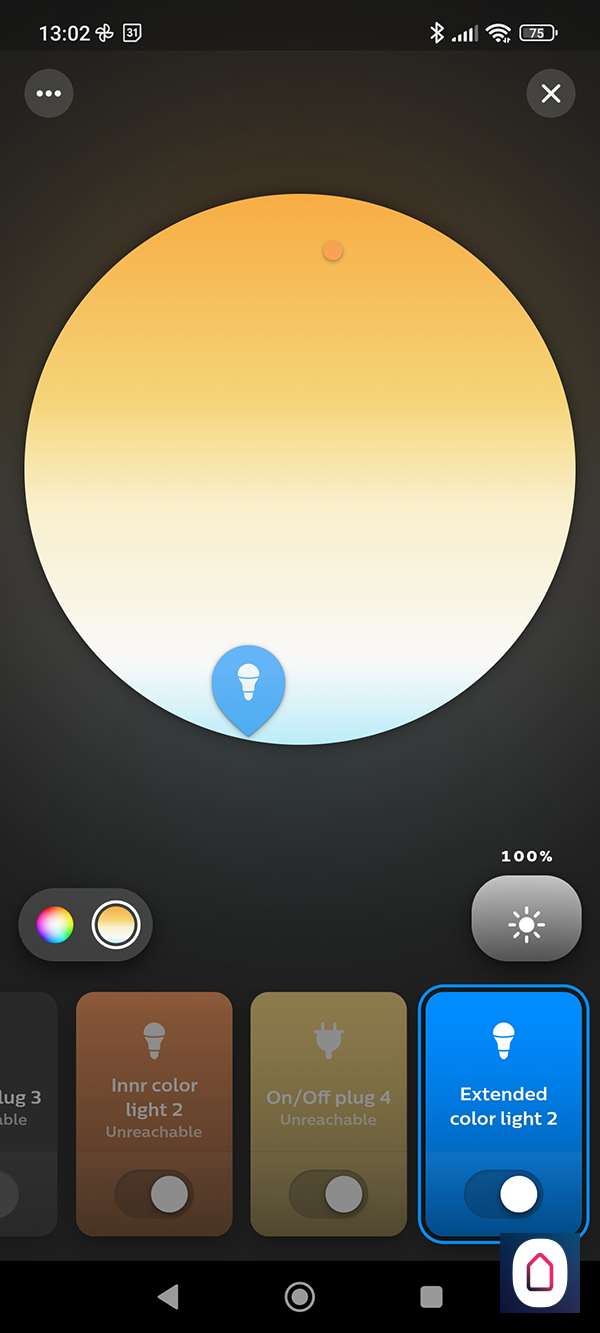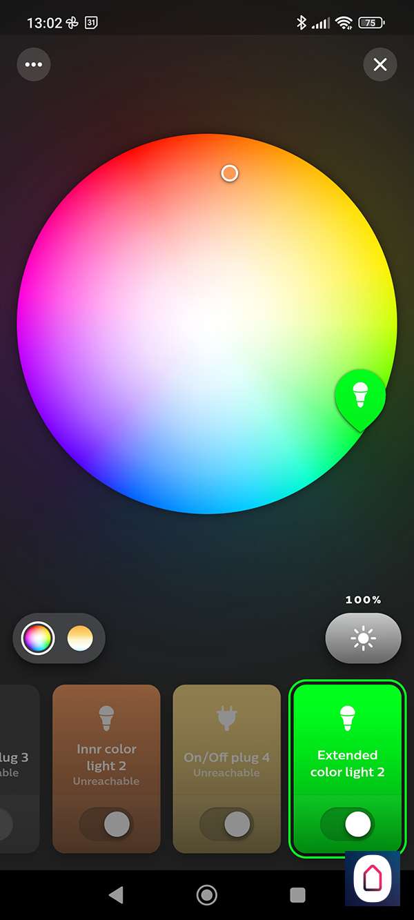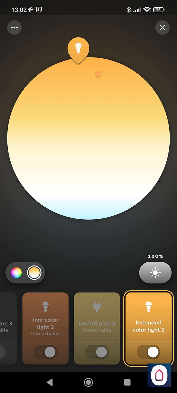 We voegen hem toe aan een kamer en zien dat we een aan-/uit schakelaar krijgen en dat we het dimniveau kunnen bepalen. We kunnen de lamp ook alle kleuren van de regenboog geven. We kunnen ook alleen de witte led veranderen. Helemaal compleet dus.