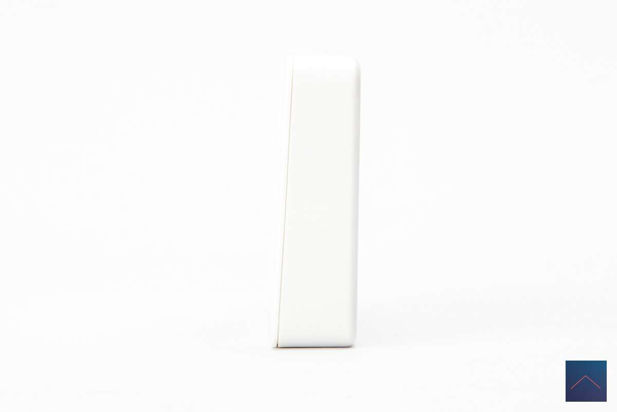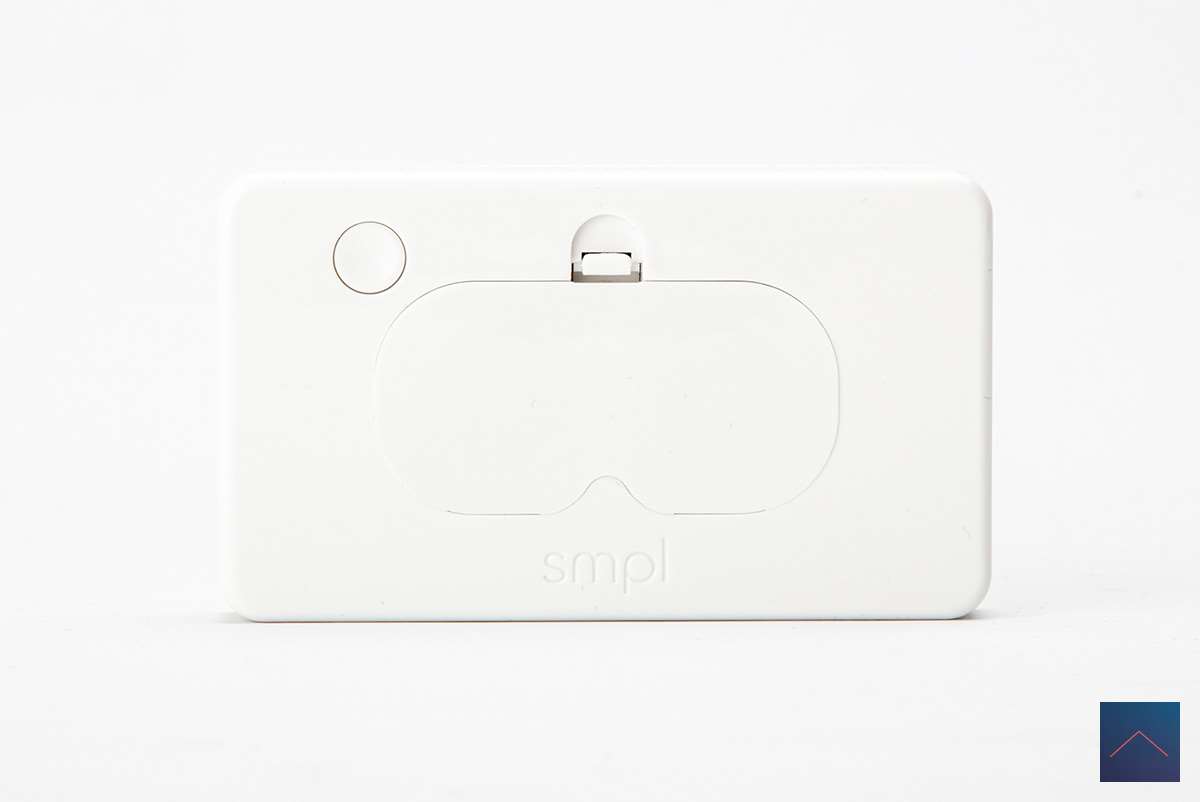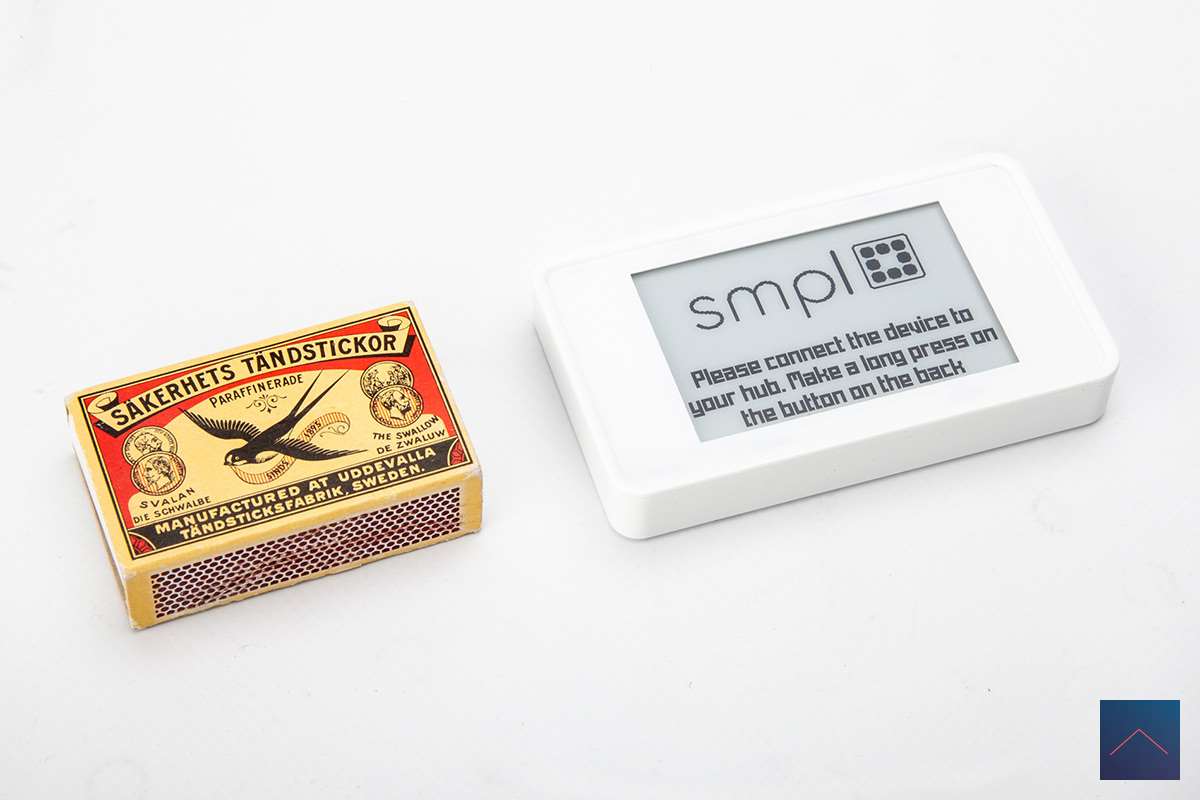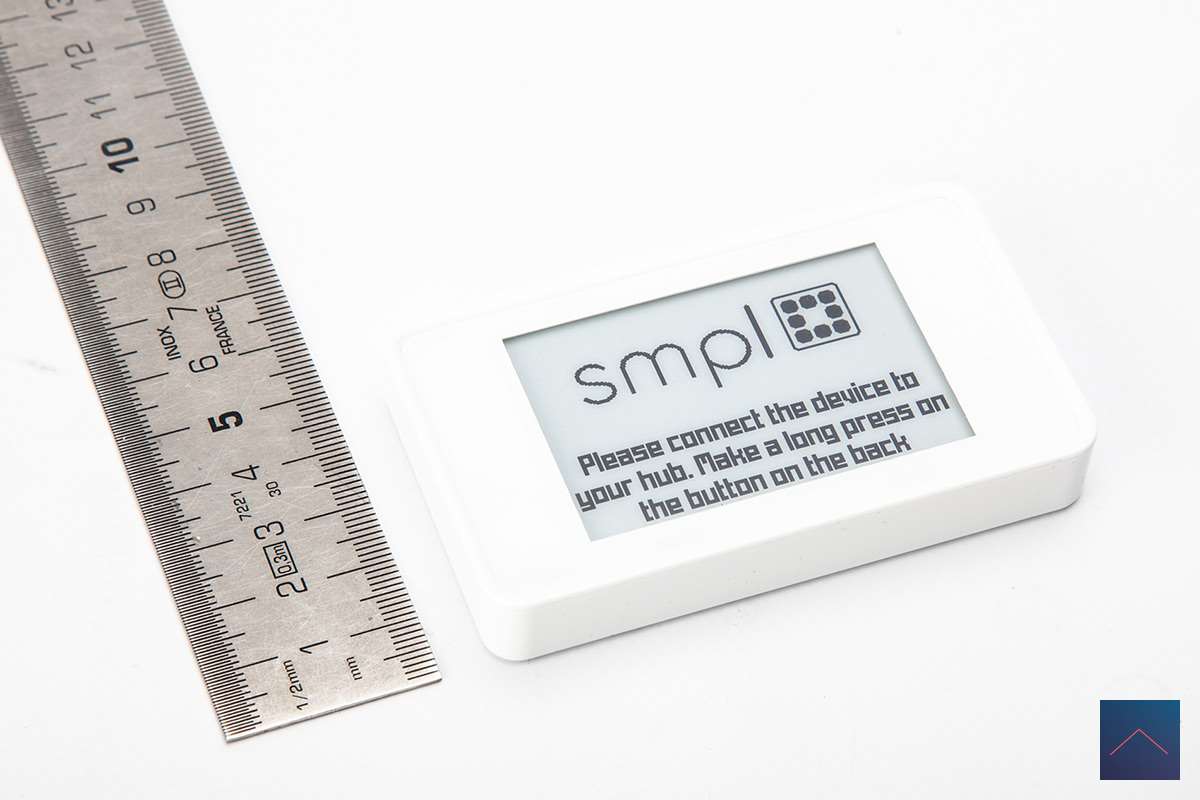 De SMPL hangt aan een beugel en is 86mm x 50mm en maar 14 mm dik. Het is gemaakt van wit kunststof en voelt stevig aan.