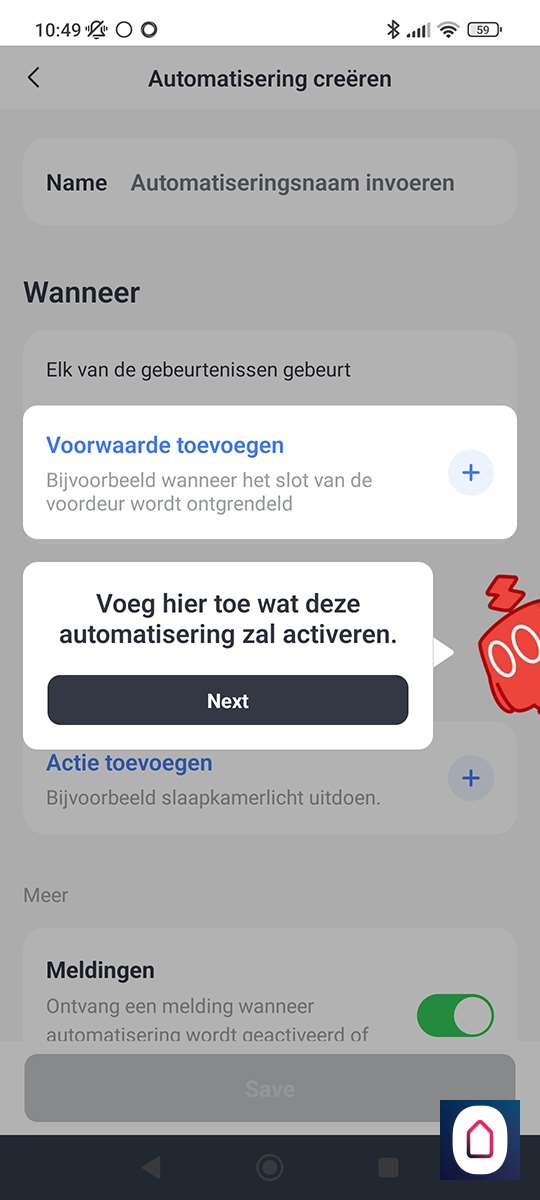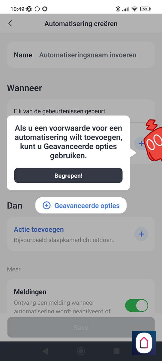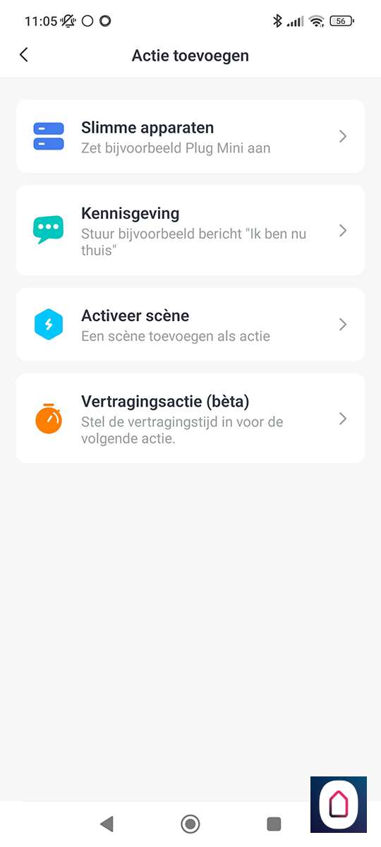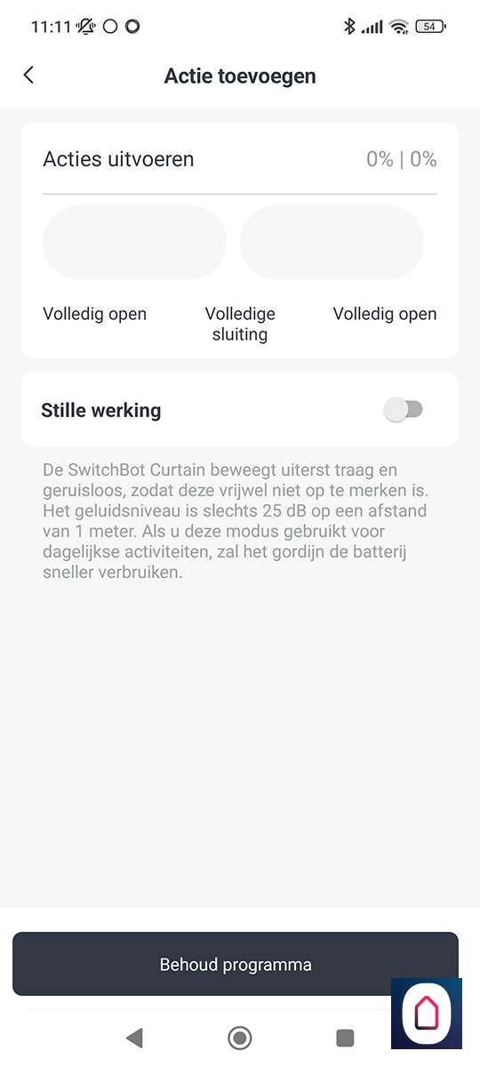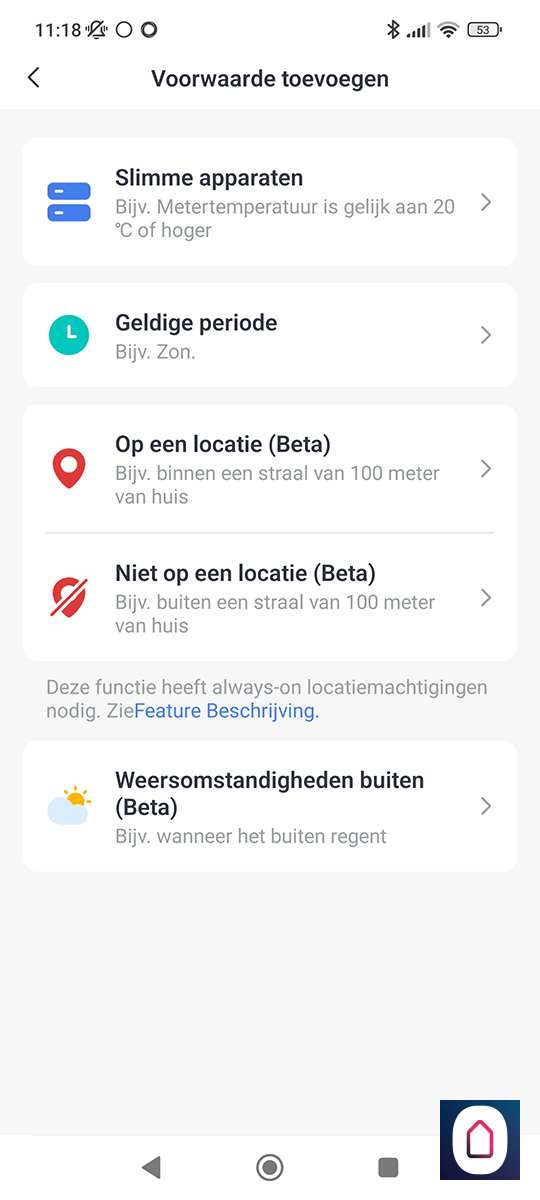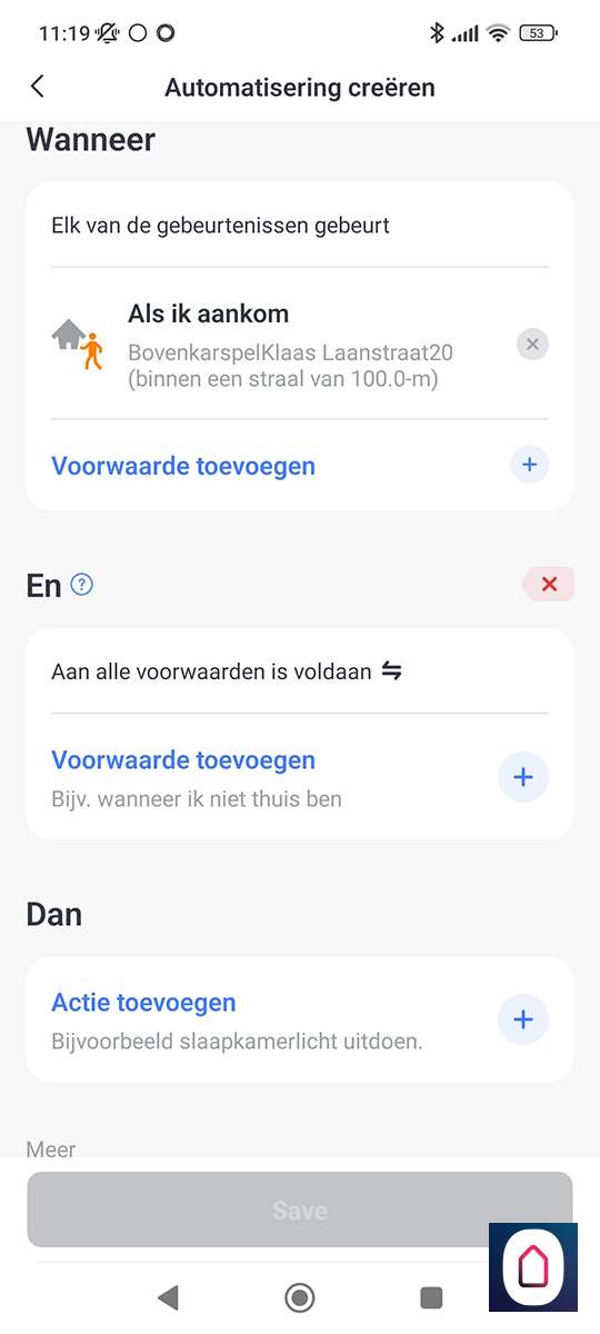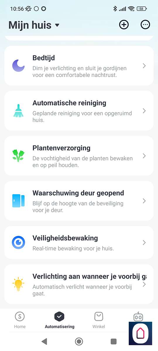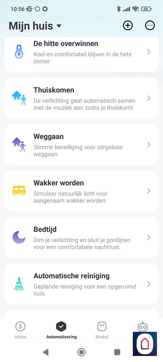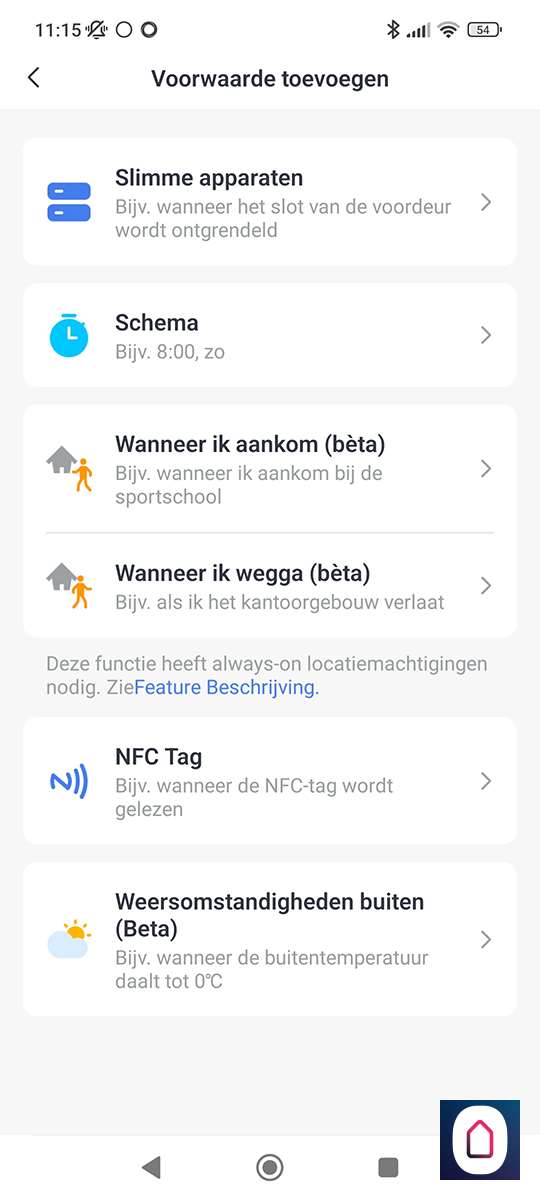 Weer even terug naar de automatisering want we hebben nu wat verschillende apparaten om mee te spelen. Met deze functie kun je automatisch of met een druk op een knop een actie opstarten. Er worden een aantal acties mee gegeven in de app. Zoals thuiskomen, deze start een actie als je thuis komt, dus bv het openen van je gordijnen. Er is ook een automatisering om een wakker scenario op te starten.