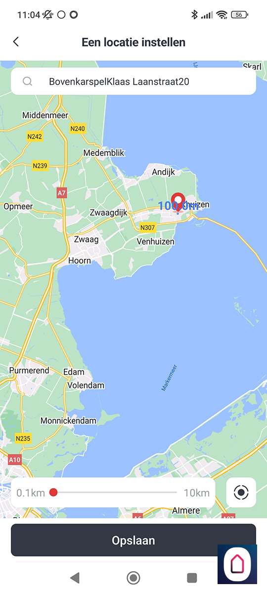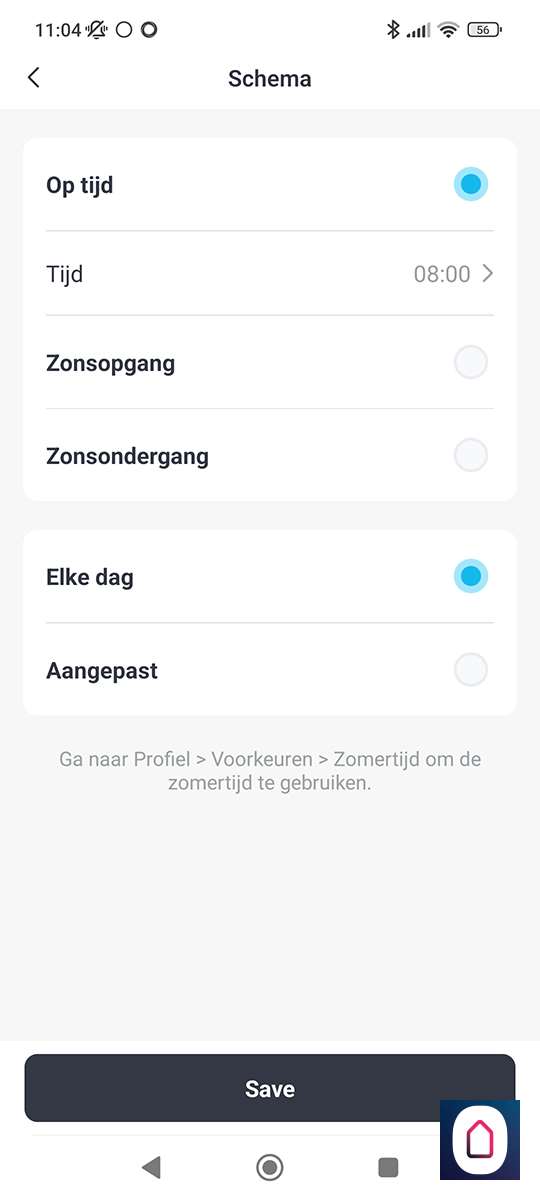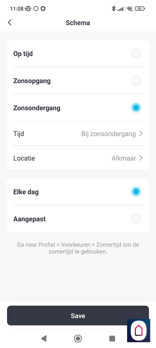 Bij de "wanneer" selecteren we weer en dan vervolgens zonsondergang. Om te zorgen dat de SwitchBot de juiste tijd weet om je even je locatie invoeren. Nu moeten we zorgen dat hij wat gaat doen door bij de "Dan" een actie in te stellen.