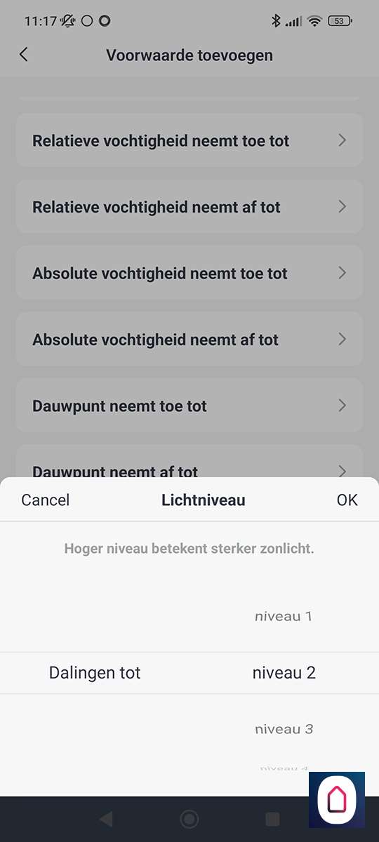 We starten met "wanneer ik aankom" en selecteren de locatie en slaan deze op. Nu voegen we nog een 2de voorwaarde tot door op bij "en" de lichtsensor van de hub te gebruiken. Als deze lager is dan niveau 2 dan mag hij pas verder.