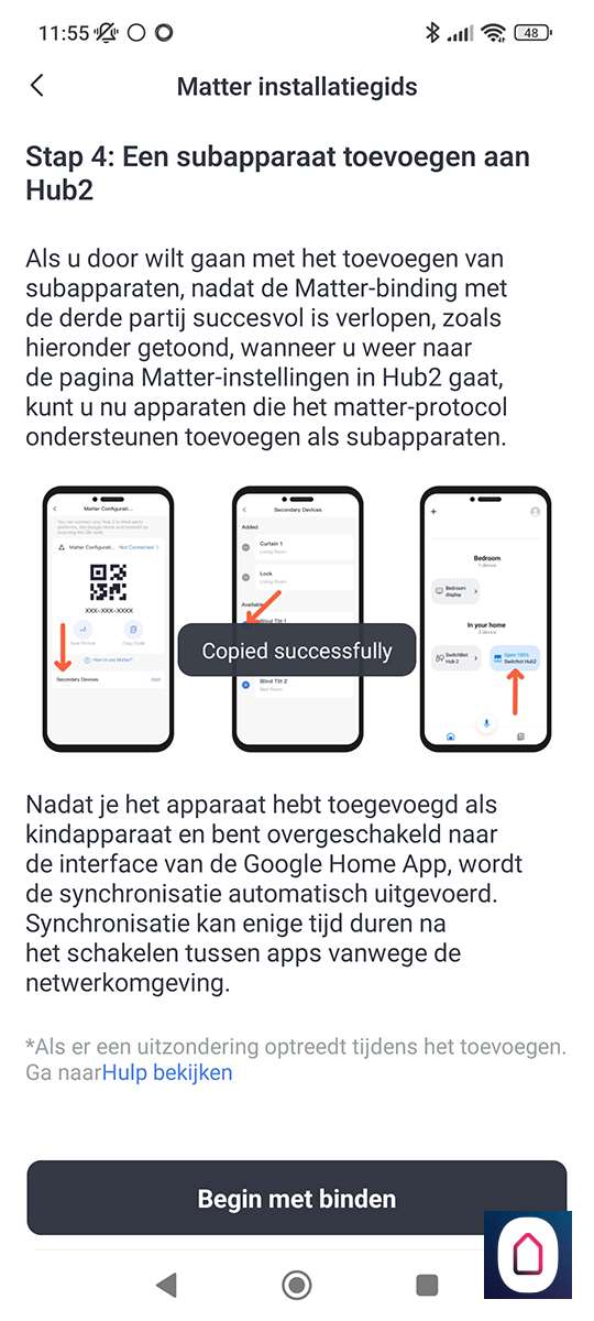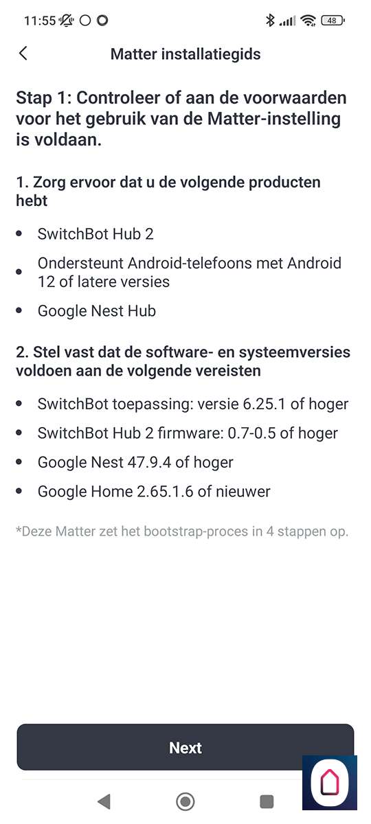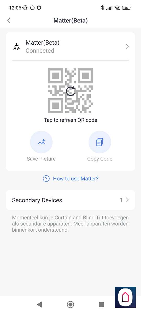 De eerste stap is om te zorgen dat je gordijnen gekoppeld zijn met het internet. Hiervoor heb je de Hub 2 nodig van SwitchBot. De Hub 2 ondersteund Matter dus we gaan hem via deze weg toevoegen. Hiervoor moet je een aantal stappen doorlopen. Deze kun je hier vinden:
