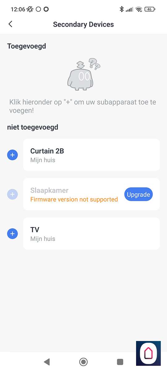 Maar uiteindelijk zagen we de lucht en temperatuur sensor maar nog niet de gordijnen. Deze moet je nog in de SwitchBot APP koppelen als sub apparaat, nadat we dit had gedaan hadden konden we hem bedienen via GH.