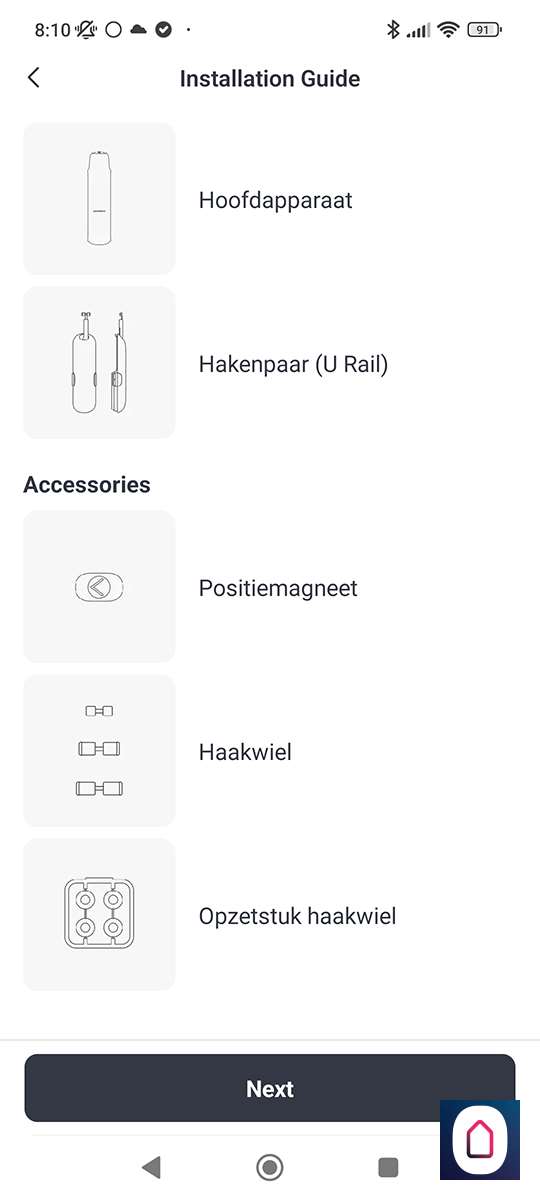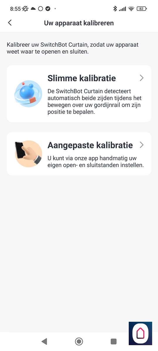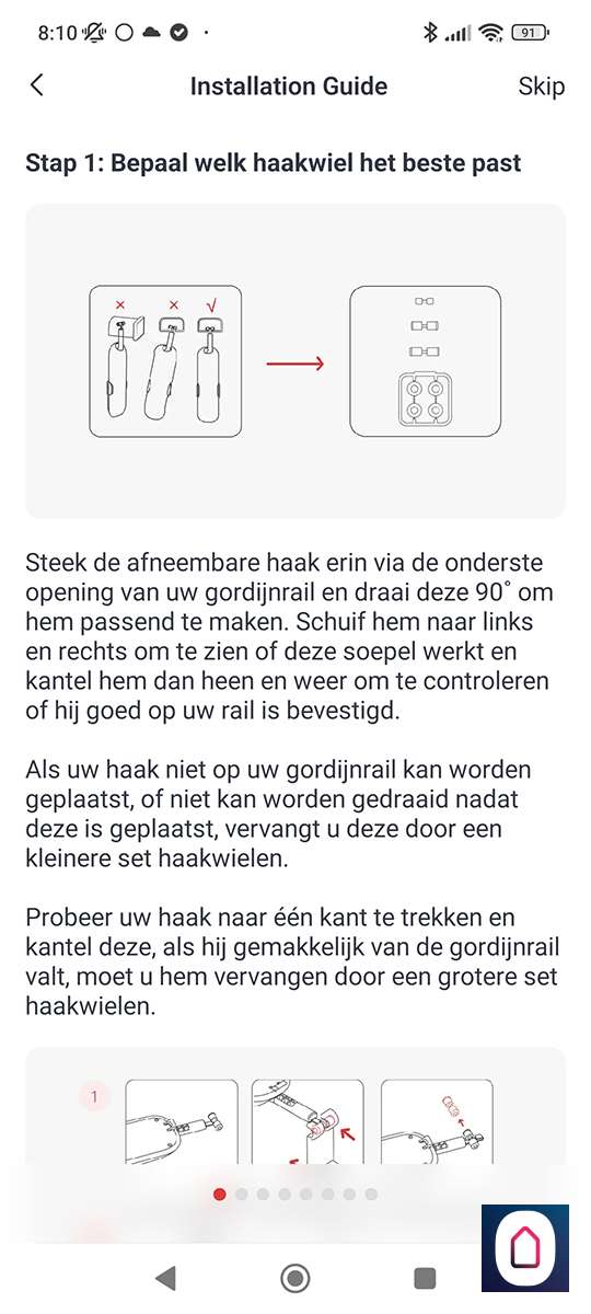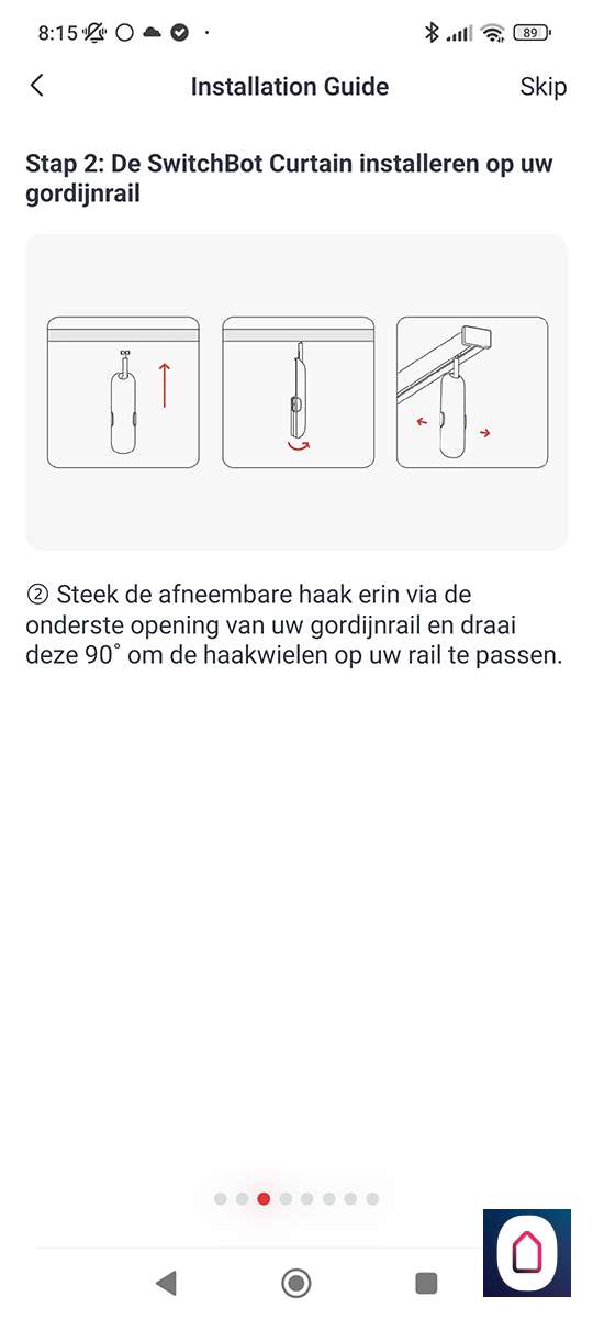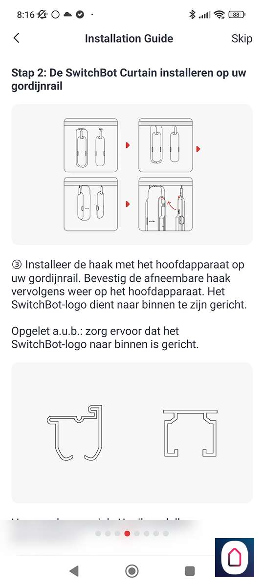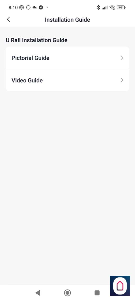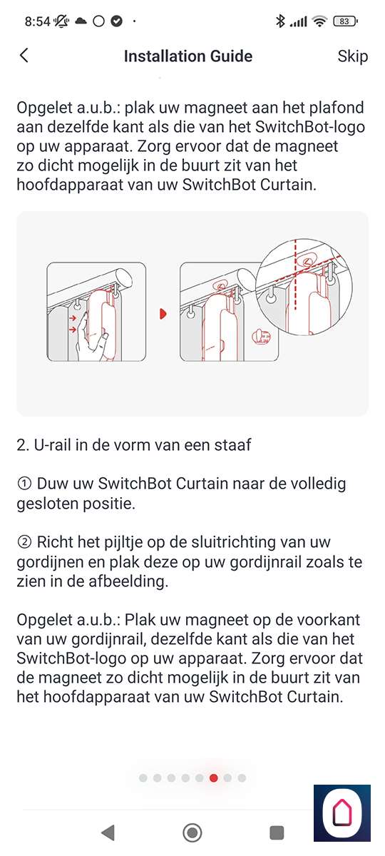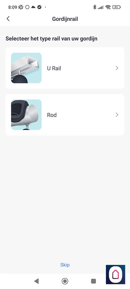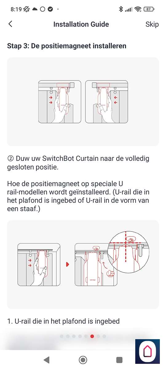 Nu de telefoon gekoppeld is aan de SwitchBot moeten we het type rail selecteren. In ons geval hebben we een U rail. Na het selecteren krijgen we de vraag of we een video of plaatjes guide willen zien. Hierin wordt de installatie stap voor stap uitgelegd. Prima geregeld allemaal.