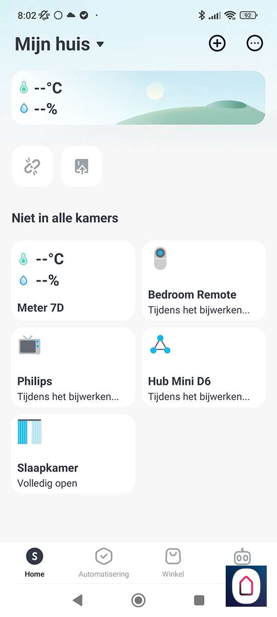Na het invullen van je gegevens moet je even je e-mailadres verifiëren. Nu kunnen we inloggen en moeten we nogmaals op het plusje drukken en op uitrusting drukken. Hierna komt een hele reeks aan producten. Wij moeten de "slimme gordijnen" hebben dus we selecteren deze.