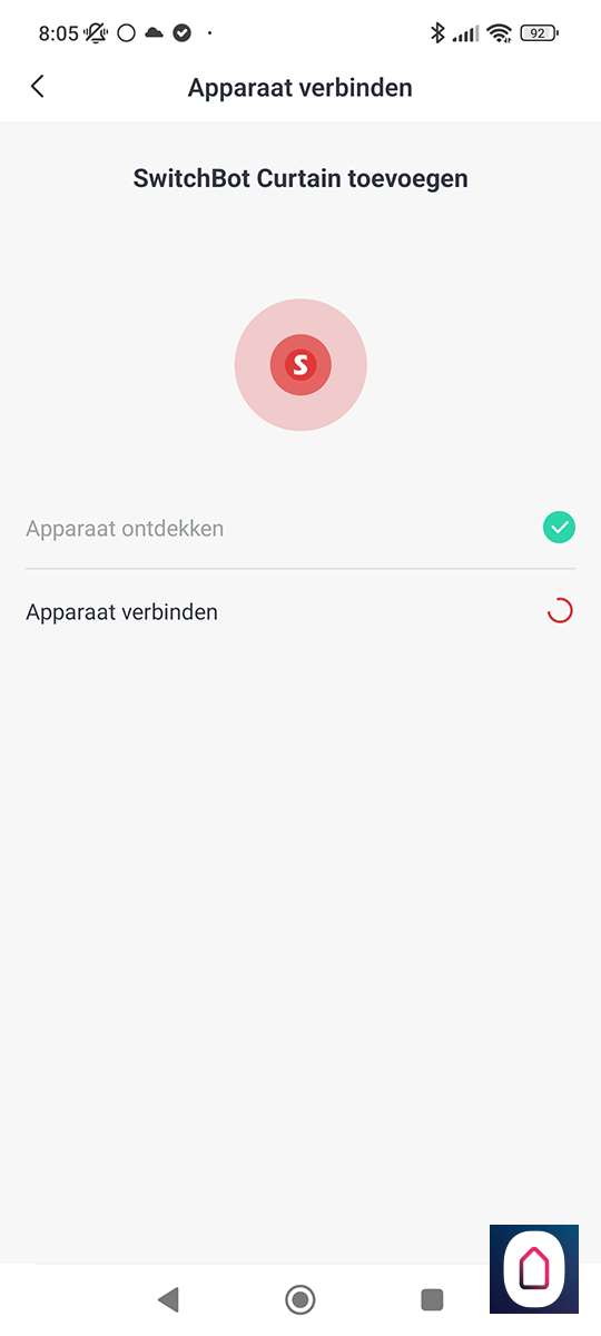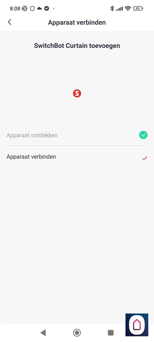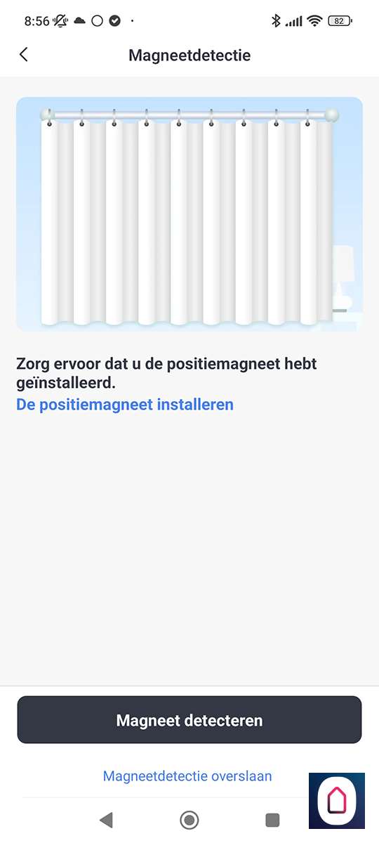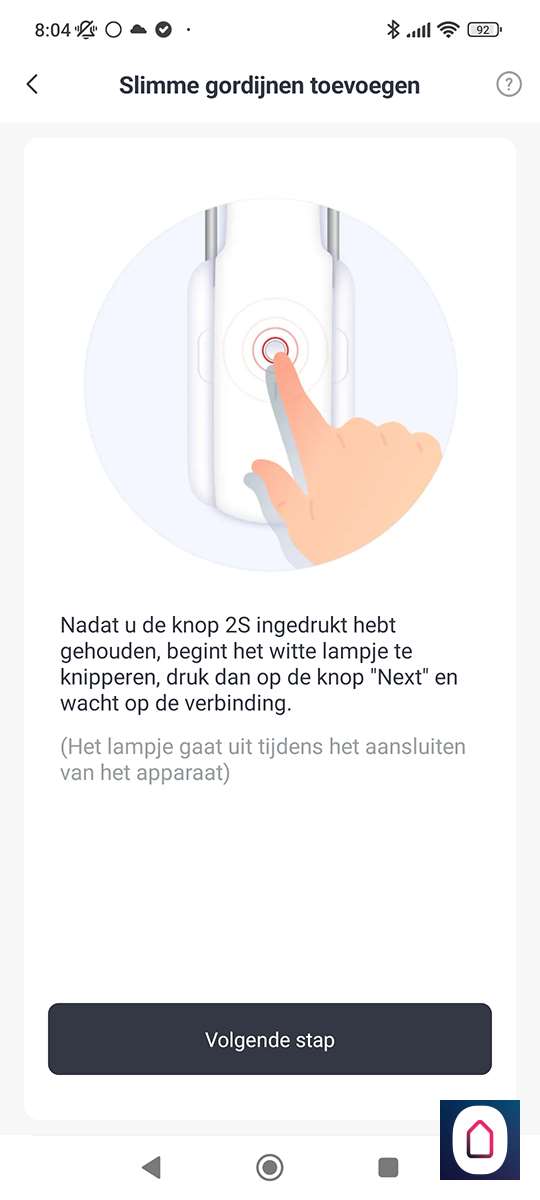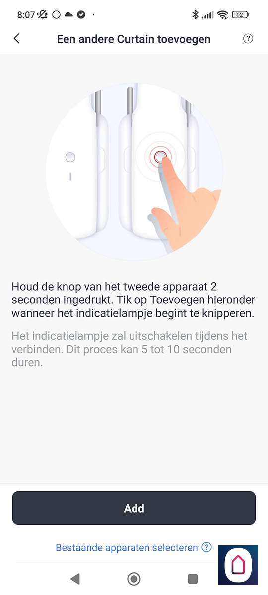 De volgende stap is om de "toevoegen" knop 2 seconden ingedrukt te houden tot het LEDje gaat knipperen, dit knopje zit aan de voorkant van de Curtain. Hierna werd hij direct gevonden. Mocht dit niet het geval zijn dan moet je zorgen dat de Curtain en je telefoon wat dichter bij elkaar komen.