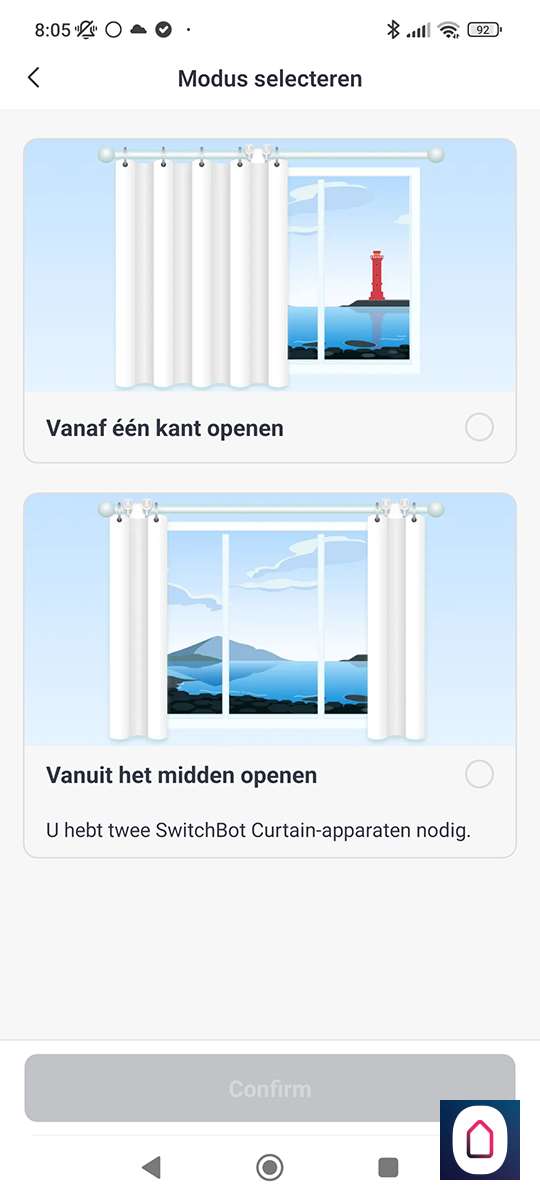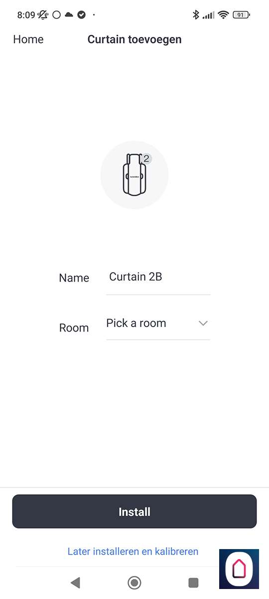Nu moeten we aangeven in welke mode de motor moet werken, dus of je 2 gordijnen hebt of 1 gordijn. In ons geval hebben we 2 gordijnen die naar het midden sluiten. Hiervoor heb je uiteraard 2 Curtains nodig. De volgende stap is om ook de 2de motor toe te voegen. Dit gaat weer op dezelfde manier. De APP is zo slim om de 2 motoren direct te groeperen zodat ze als 1 werken.