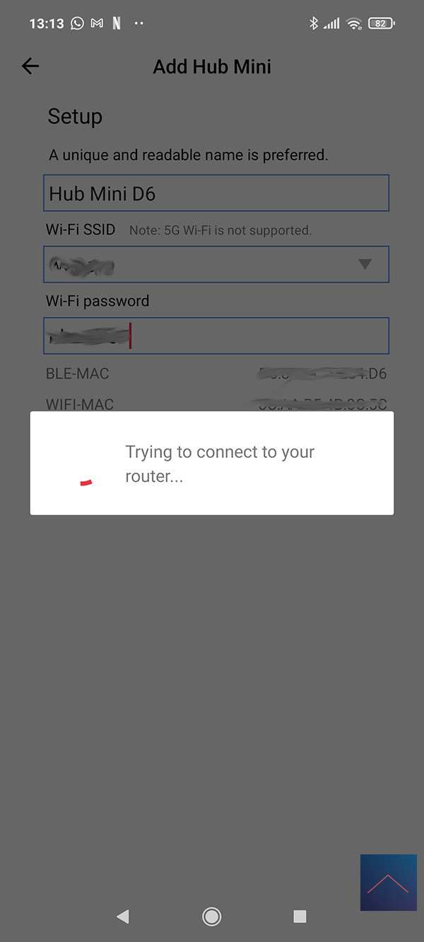 De eerste stap is om hem te voorzien van stroom dit kan d.m.v. een standaard USB adapter (deze wordt niet meegeleverd). Ga vervolgens naar de APP en druk op het plusje. In mijn geval zag ik de HUB direct bovenin staan (anders moet je hem even selecteren). Nu moeten we het knopje 3 seconden ingedrukt houden om hem toe te voegen. Hij werd direct gevonden en kan nu mijn WiFi gegevens invoeren. Na enkele seconden geeft hij een melding dat hij verbonden was en ik zie hem op mijn startscherm.