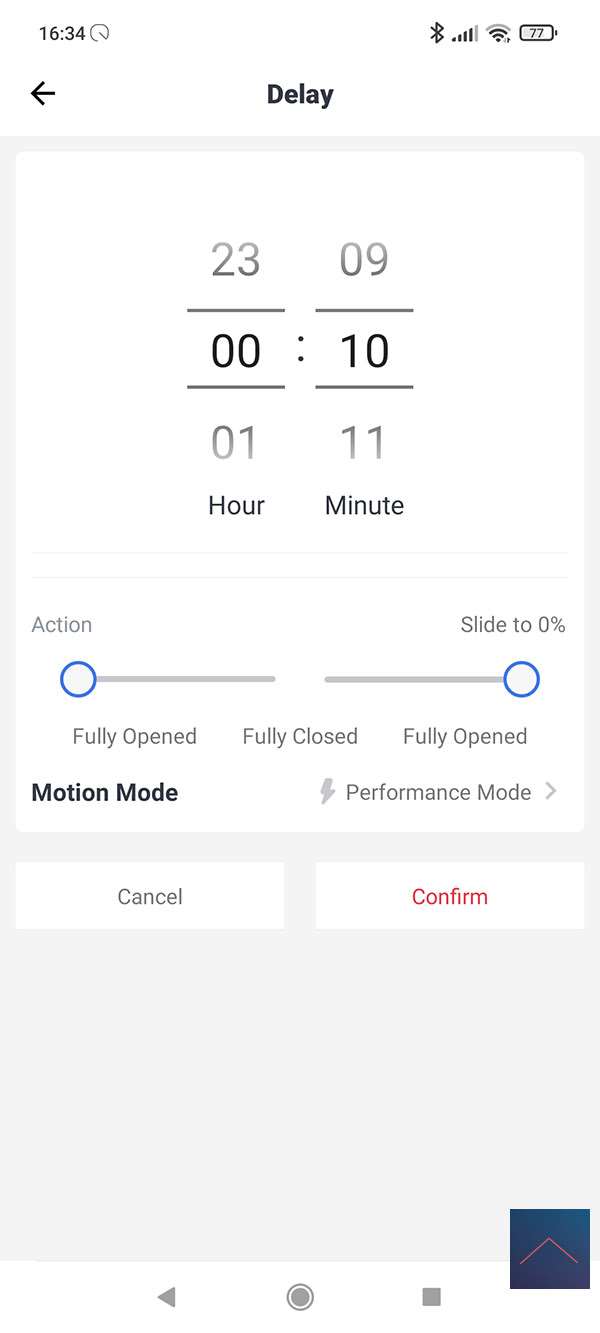 Je kunt een vertraging instellen voordat de gordijnen open of dicht gaan. Geen idee waarom je dit zou willen.