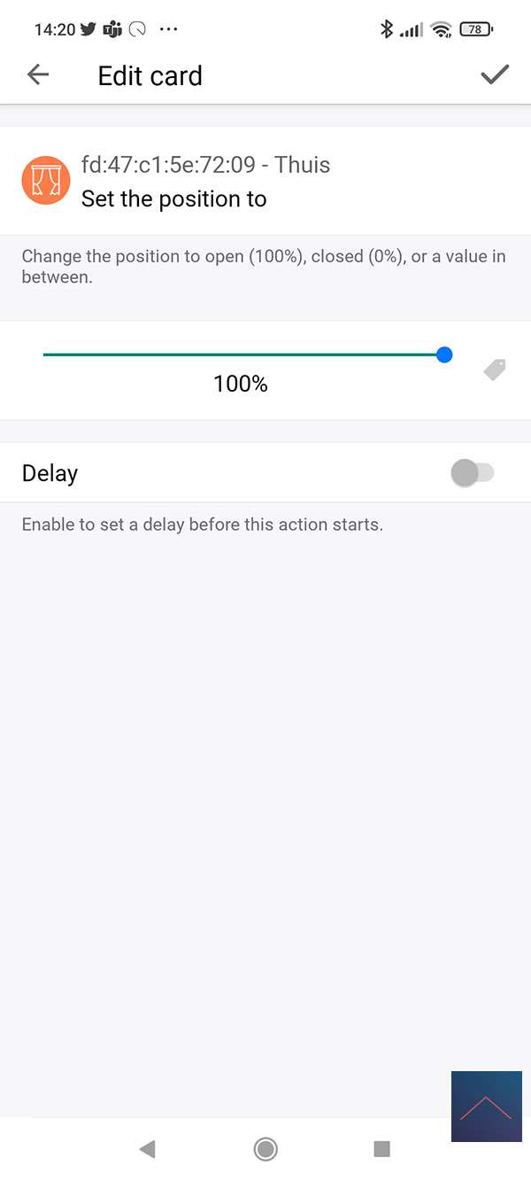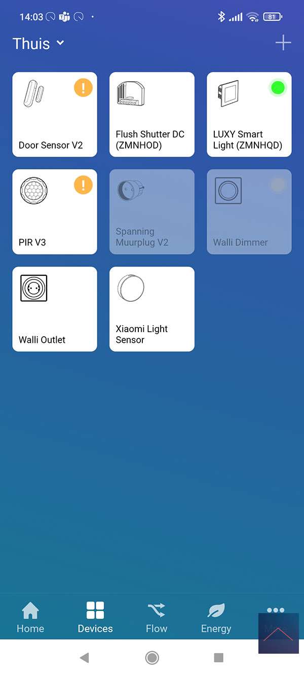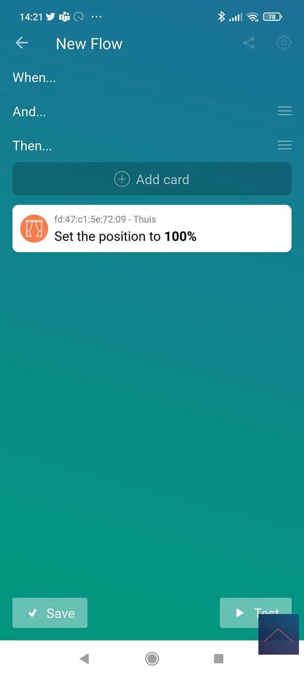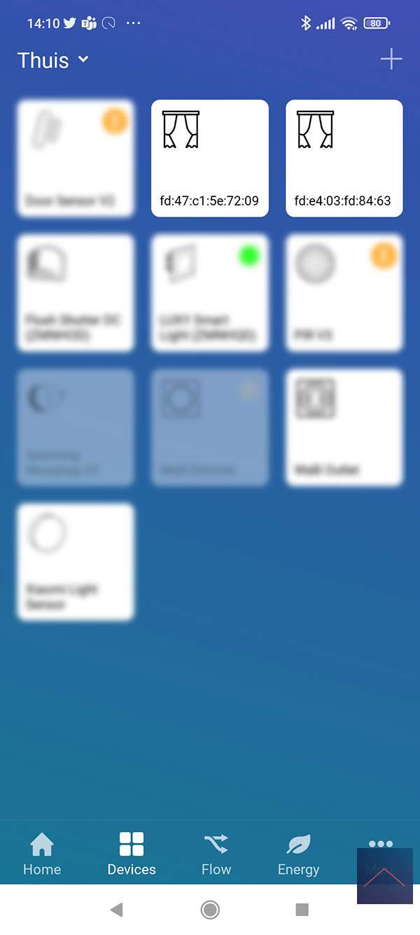 De Homey maakt van elke motor 1 apart gordijn, ik zie dus 2 gordijnen in de APP. In mijn geval zou deze moeten samenvoegen omdat ik een gordijnen heb welke naar het midden opent/sluit. Dit is wel wat onhandig als je hem open wil doen. Je zou dan 2x moeten klikken. Om dit op te lossen kun je een virtuele schakelaar aanmaken die door middel van een flow de gordijnen open/dicht doen.