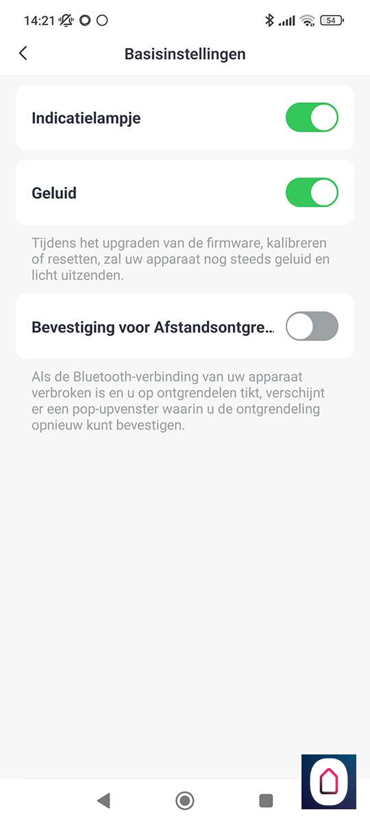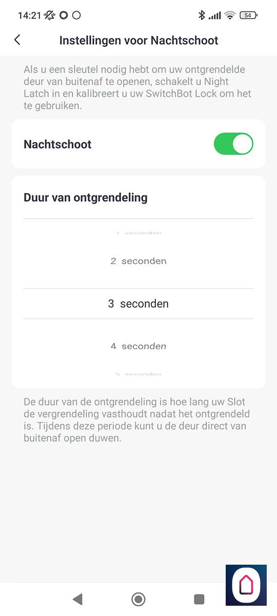 In de APP zijn best veel instelmogelijkheden. Zo kun je bv instellen hoelang het nachtslot open moet blijven. Je kunt ook instellen hoe de knop aan de voorkant reageert, bv dat je 2x op de knop moet drukken voordat er wat gebeurt. Wel zo handig want we hadden al een paar keer dat we hem per ongeluk indrukten.