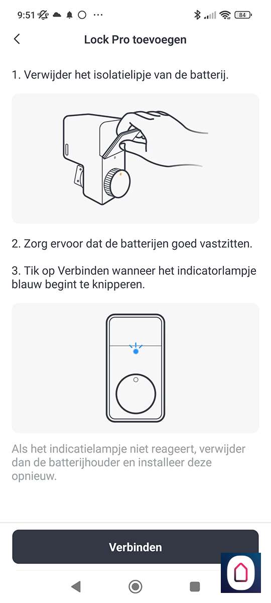 Nu verwijderen we het lipje bij de batterij, hierdoor zal het slot in de leerstand gaan (de LED knippert langzaam blauw). Nu openen we de APP en klikken op het plusje en volgen de instructies.