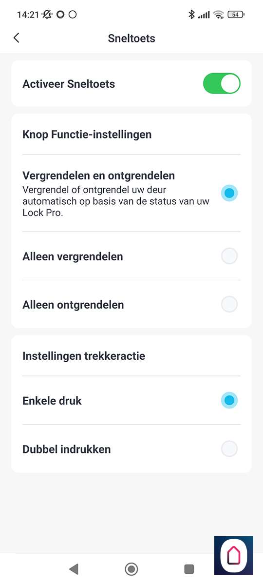 Als je de knop aan de voorkant indrukt zal hij op slot gaan, als het slot open is, en andersom. Als hij open is zal hij op slot gaan. In de APP zijn diverse instellingen om te regelen wat de knop doet. Zo kun je hem helemaal uitzetten, of je 1x of 2x moet drukken en of hij alleen moet vergrendelen of juist alleen moet ontgrendelen.