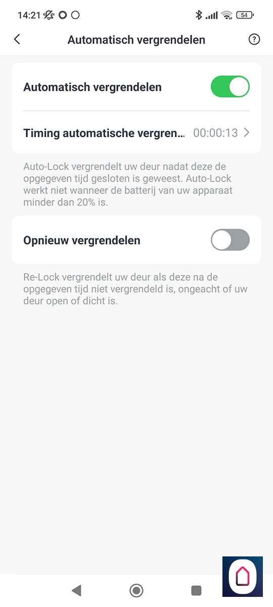 Je kunt wel via de APP instellen dat het slot altijd automatisch vergrendelt wordt nadat je hem hebt geopend. Op deze manier zal het slot nooit zomaar open staan.