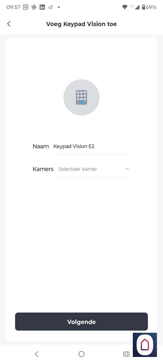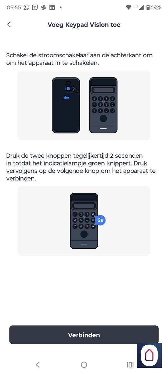 Aanzetten van de keypad dit kun je doen dmv het knopje aan de achterkant. We zien het slot direct verschijnen omdat we de keypad, het slot en de telefoon dichtbij elkaar hebben. Nu moet je het slot knopje en het vinkje 2 seconden tegelijk indrukken. De LED zal groen gaan knipperen.