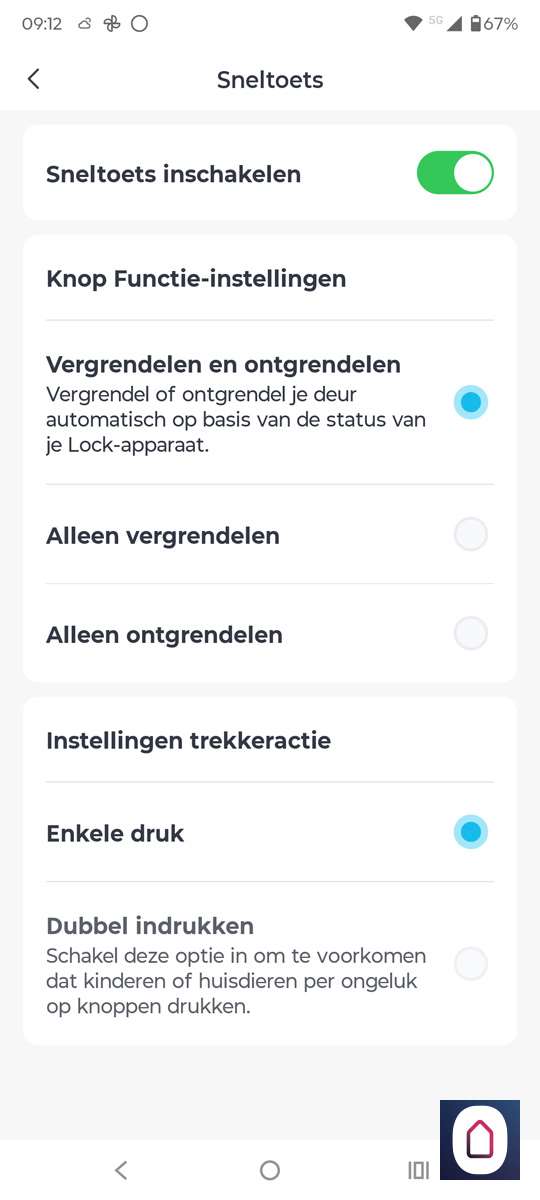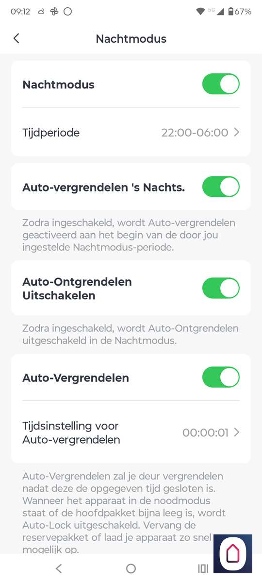 In de praktijk kozen wij voor automatische vergrendeling na 30 seconden. Dat gaf net genoeg tijd om bijvoorbeeld even de vuilnis buiten te zetten zonder dat we telkens de deur opnieuw moest openen. Fijne gedachte dat je deur altijd op slot is.