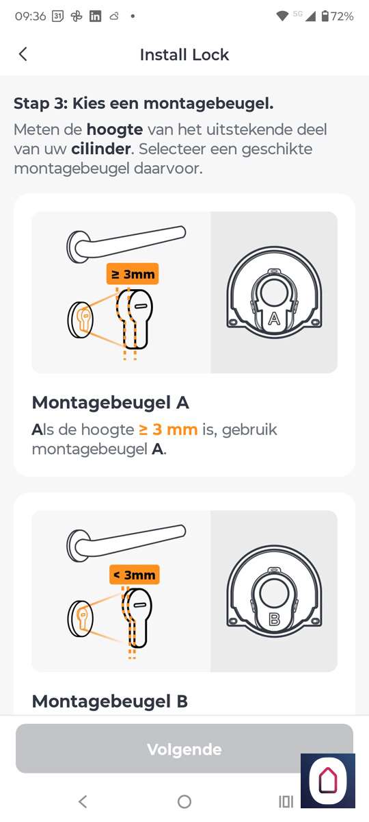 Om het slot aan de sleutel vast te maken worden 2 adapter platen meegeleverd: type A en type B. Dit is hetzelfde systeem als bij de Nuki. Om te bepalen welke je nodig hebt moet je kijken hoever het slot uitsteekt t.o.v. je schildplaat. Als hij groter is dan 3 mm dan gebruik je type A en als hij kleiner is type B. Verschil tussen deze 2 adapters is de bevestigingsmethode. Deze schroef je vast en de andere plak je vast.