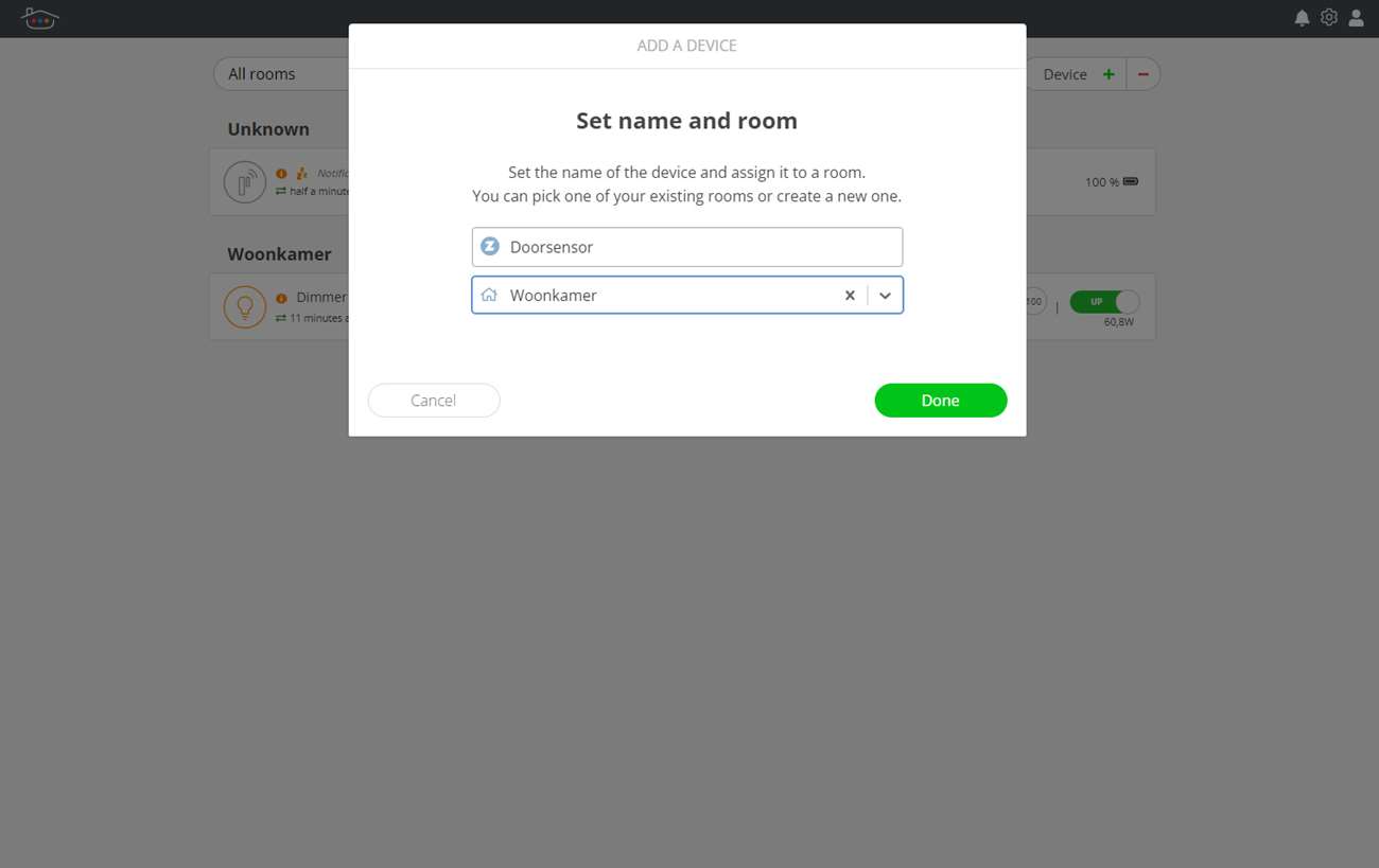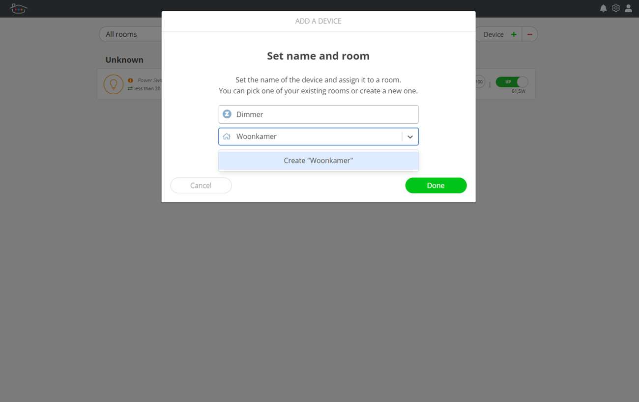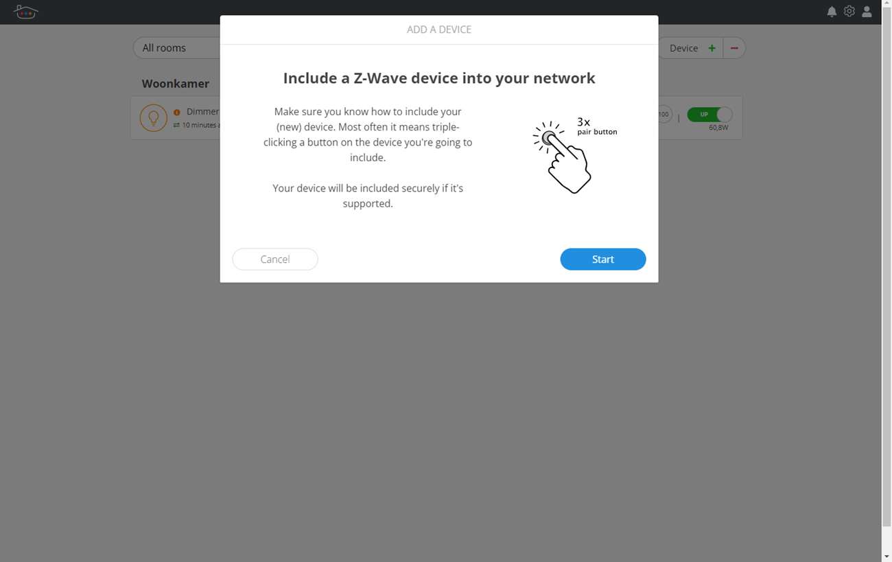 Nu we alles voorzien hebben van stroom, starten we het toevoegen. We gaan het toevoegen eerst via de webinterface doen. Dus we drukken op het groene plusje, hierna wordt gevraagd de dimmer in de leermodus te zetten. Hoe dit moet verschilt per apparaat en kun je in de handleiding vinden. In het geval van de dimmer drukken we drie keer achter elkaar op de schakelaar.