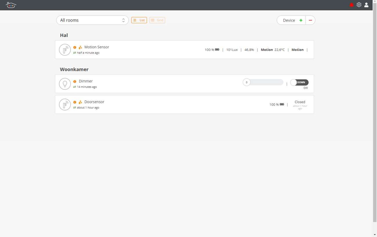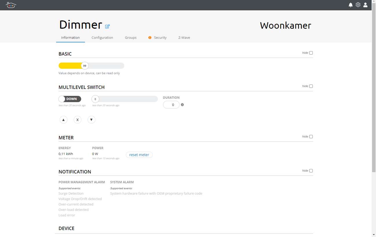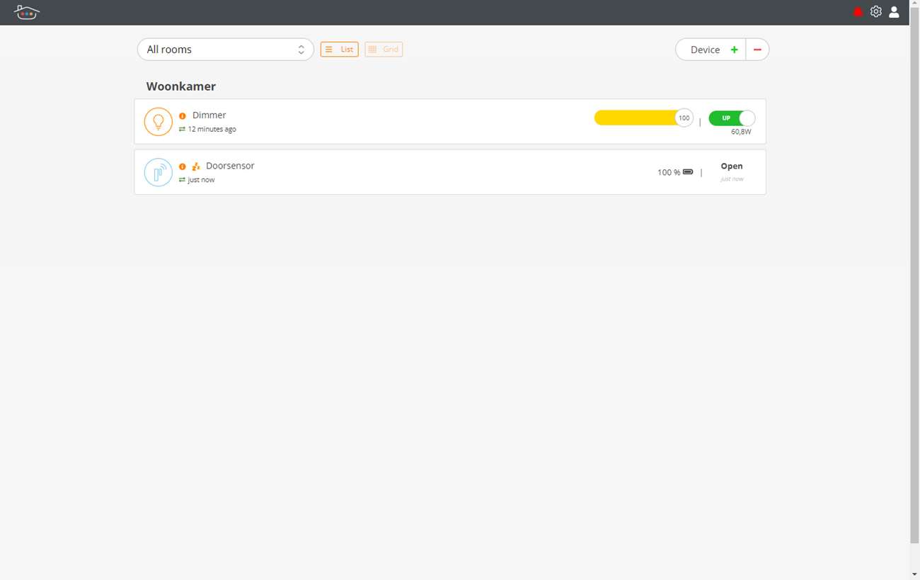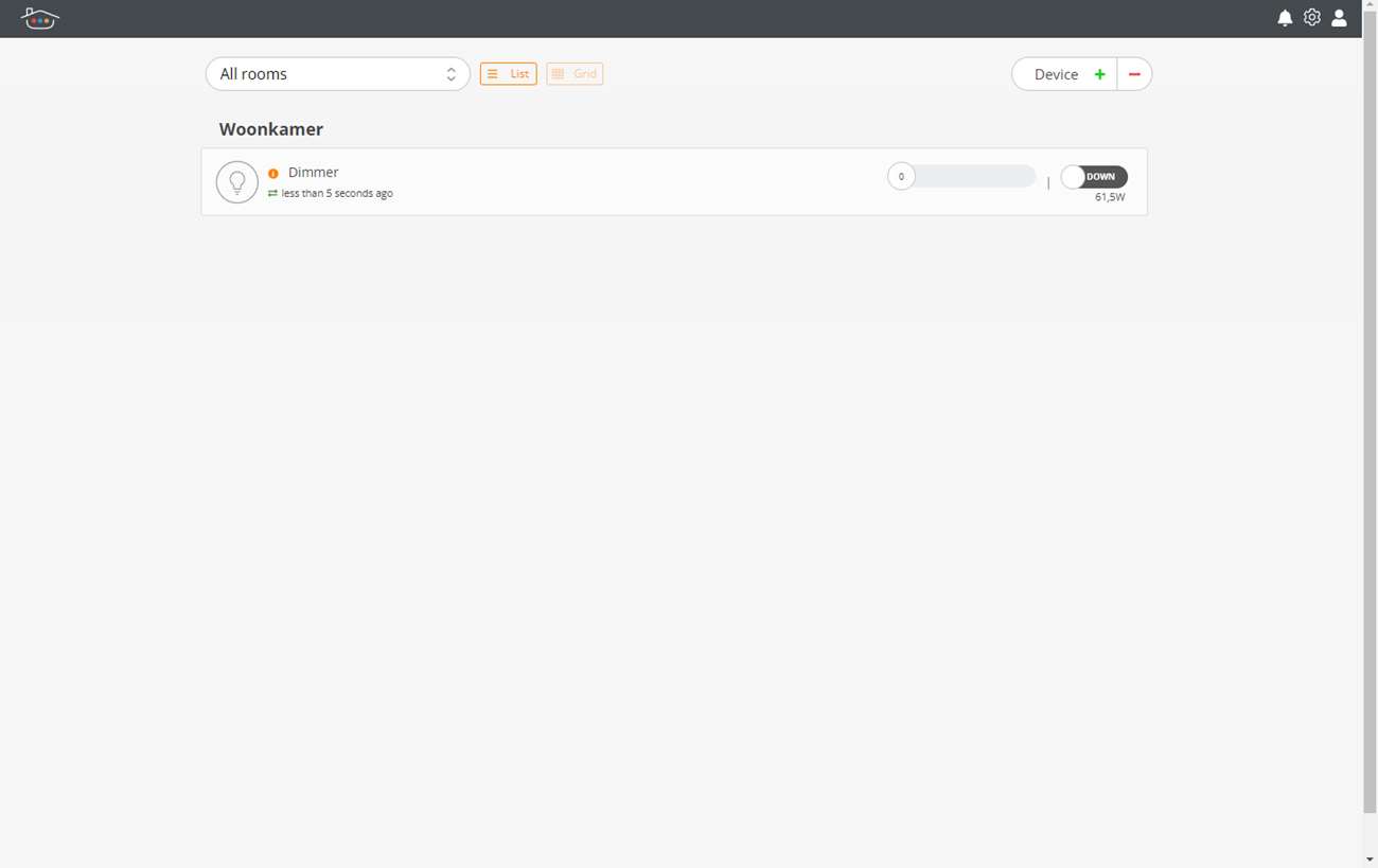 Ik krijg de mogelijkheid om de dimmer aan of uit te zetten en uiteraard kan ik hem ook dimmen. Ik zie tevens het energie verbruik. Mooie van deze oplossing is dat je ook de wandschakelaar kunt blijven gebruiken. Deze geeft ook een signaal naar de Thinka zodat daar ook de juiste status te zien is.