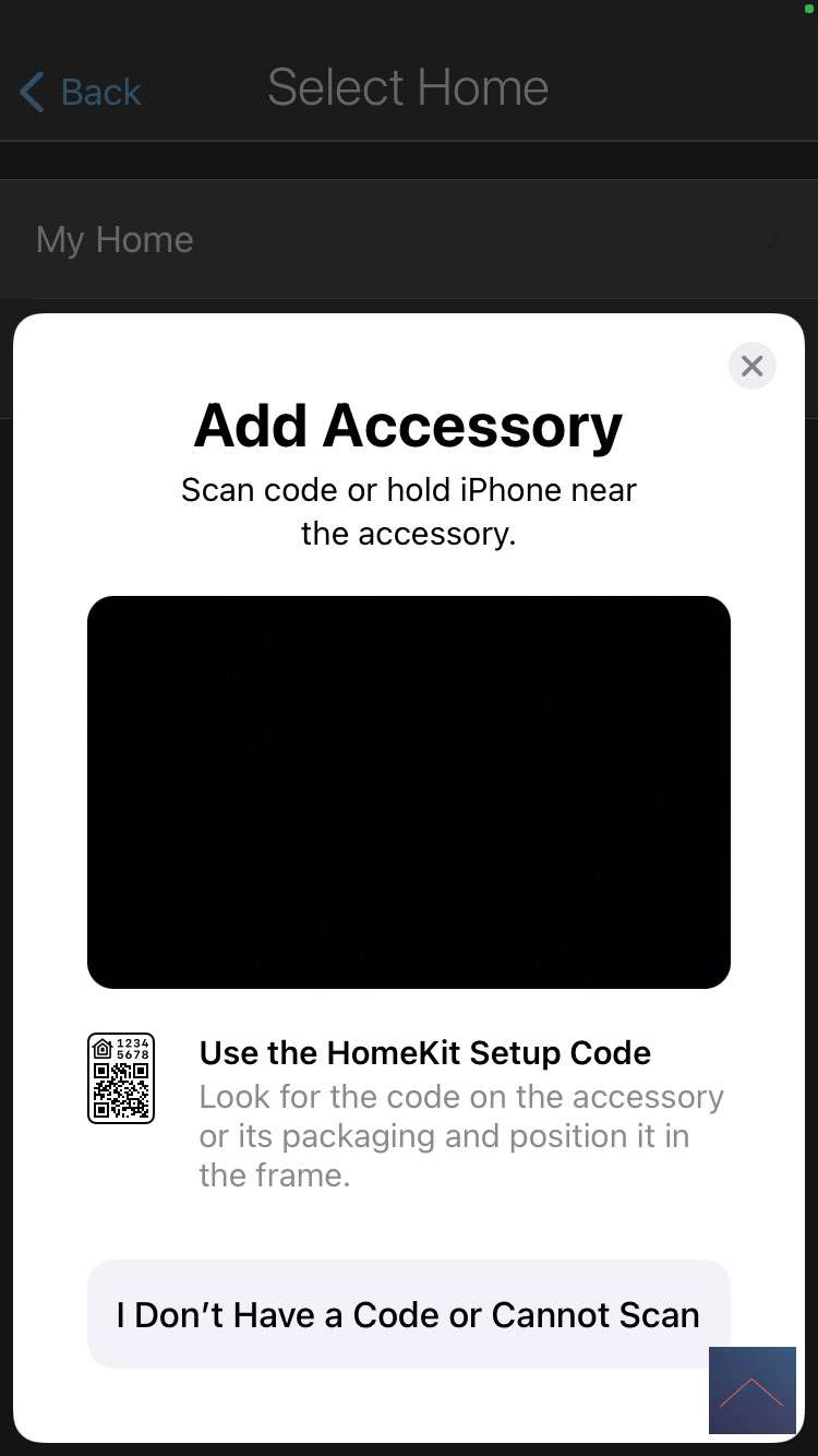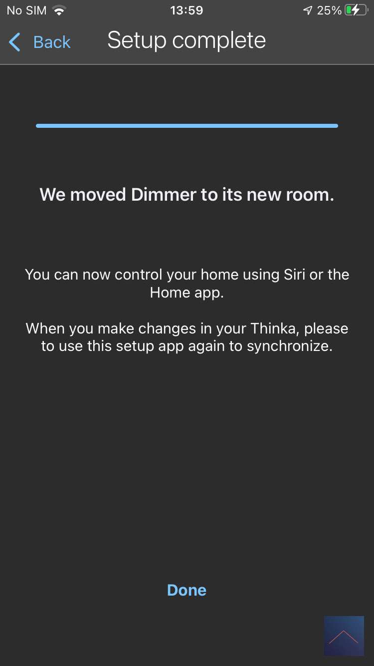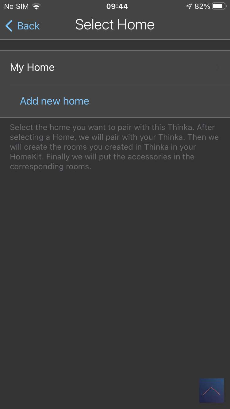 Nu moeten we HomeKit koppelen aan onze Thinka. Dit kan je doen door naar de APP te gaan en "Choose a home" te selecteren. Er wordt vervolgens gevraagd om de code op de onderkant van de Thinka in te scannen. Hij werd vrijwel direct gevonden en geeft aan dat we een dimmer hebben.