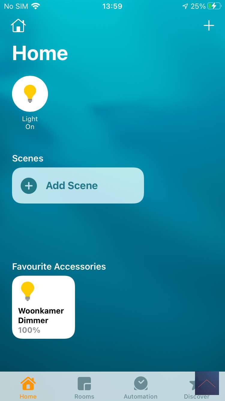 Nu kunnen we de HomeKit App opstarten en daar zie ik ook mijn dimmer staan en we kunnen deze bedienen.