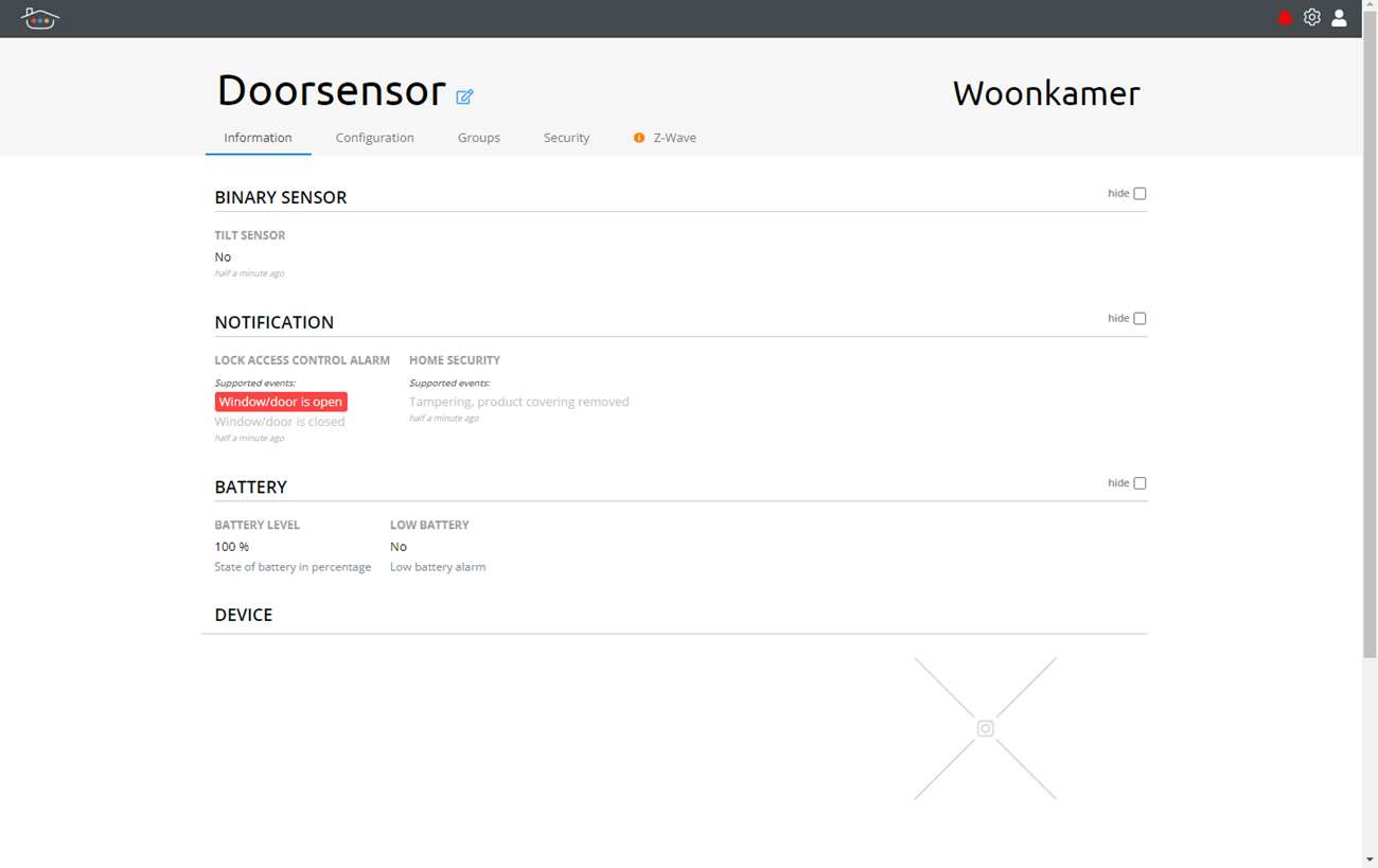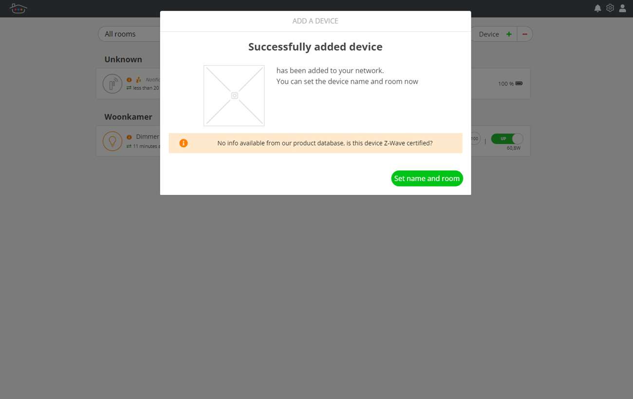 We klikken weer op het plusje en halen het klepje los van de sensor, we moeten namelijk het kleine knopje aan de zijkant 3x achter elkaar indrukken. Zoals bij de dimmer werd hij weer snel gevonden. Er komt alleen een melding in beeld dat er geen info beschikbaar is in de database. We gaan maar gewoon verder en zien de sensor op het dashboard komen.