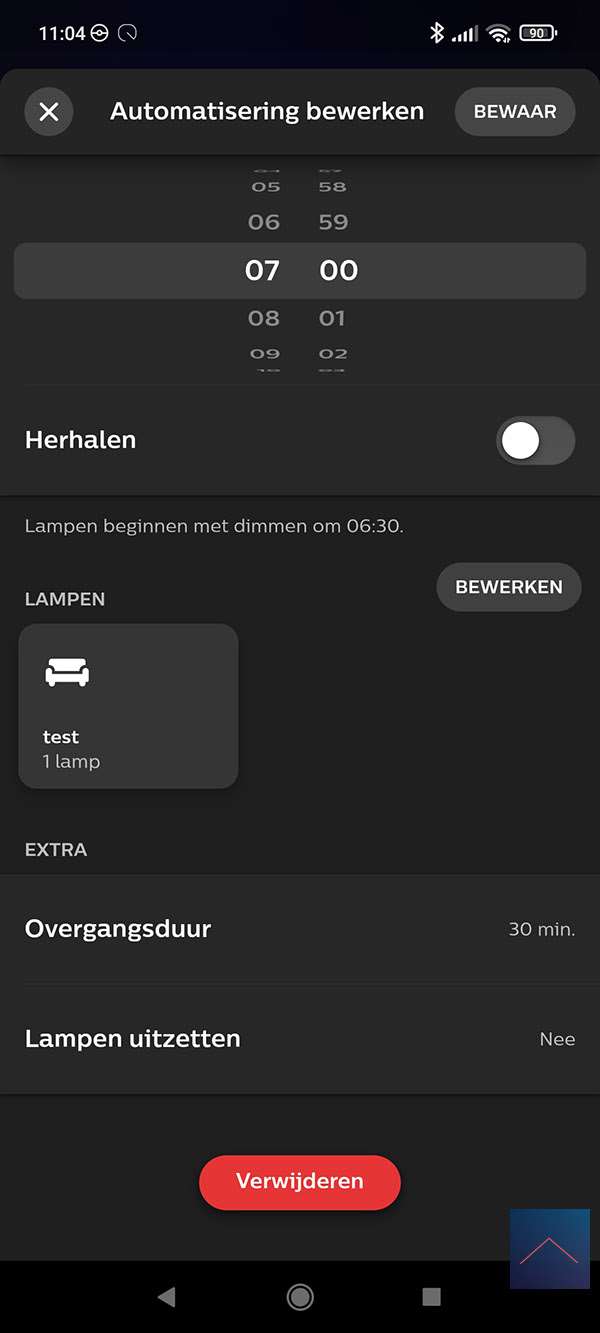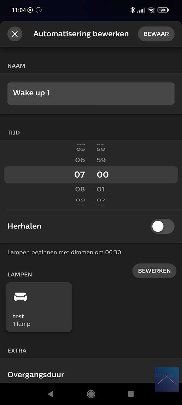 We maken de regel dat als het 07.00 is, dat de lamp geleidelijk wordt aangezet.