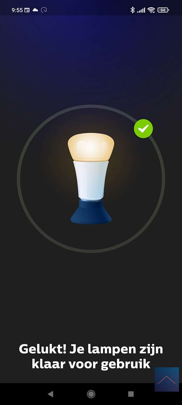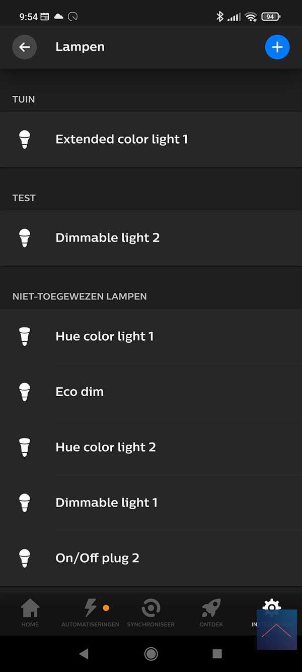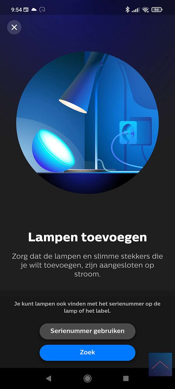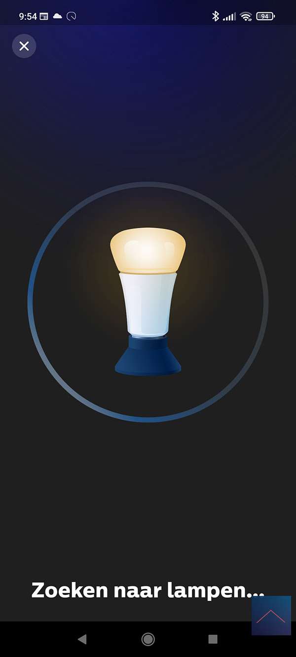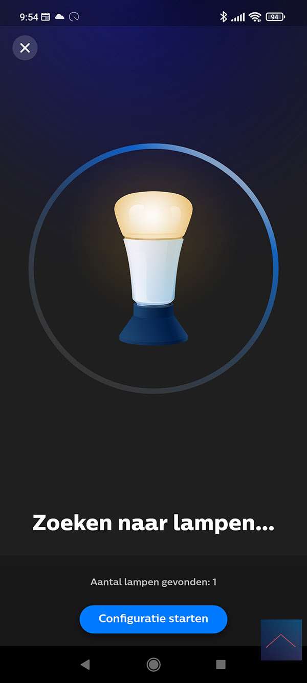 Als eerste stap starten we de Philips HUE APP op en gaan naar de instellingen (radartje onderin). We drukken vervolgens op "lampen" en hierna op het plusje. We volgen wat stappen en komen uit dat we de lamp in de leerstand moeten zetten. Dit kun je doen door de lamp 5x aan/uit te zetten. De lamp knippert en ik zie dat hij gevonden wordt.