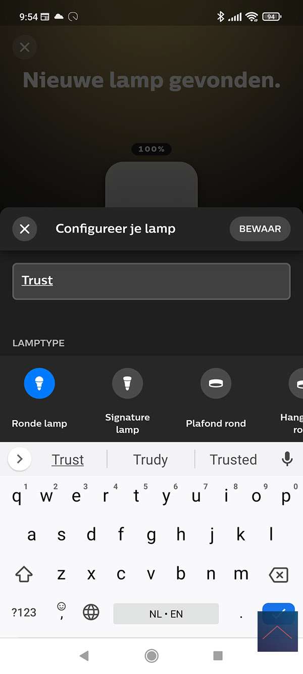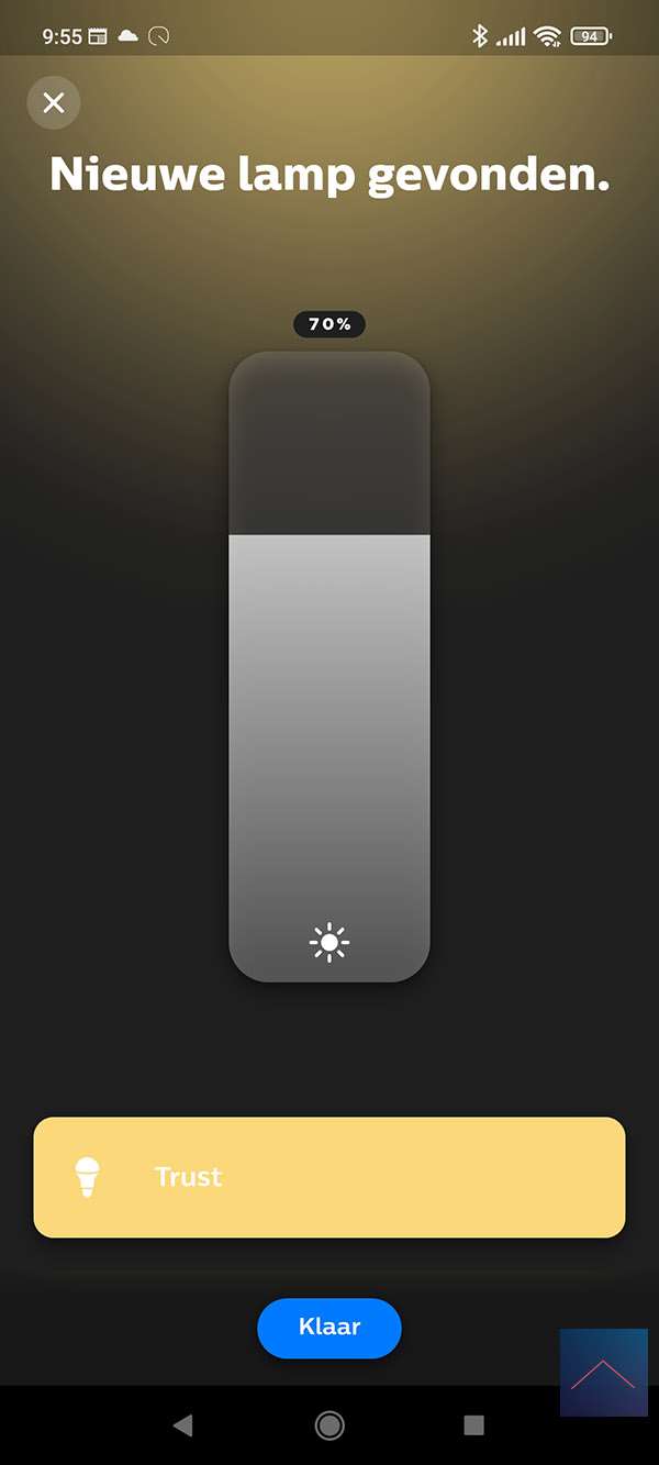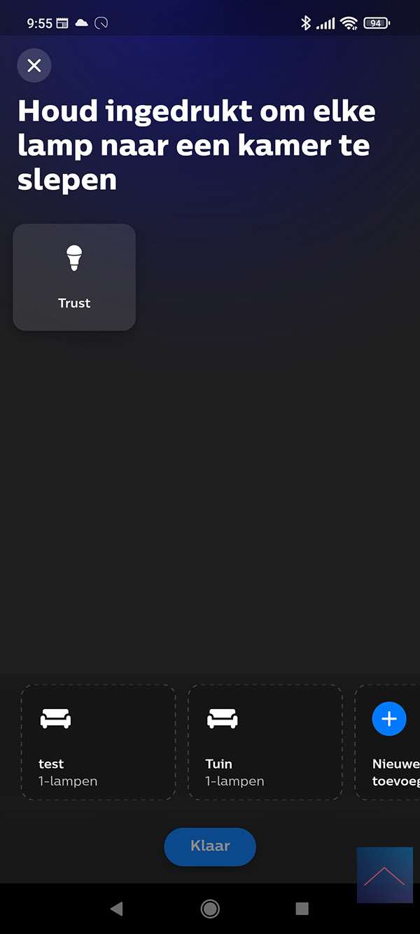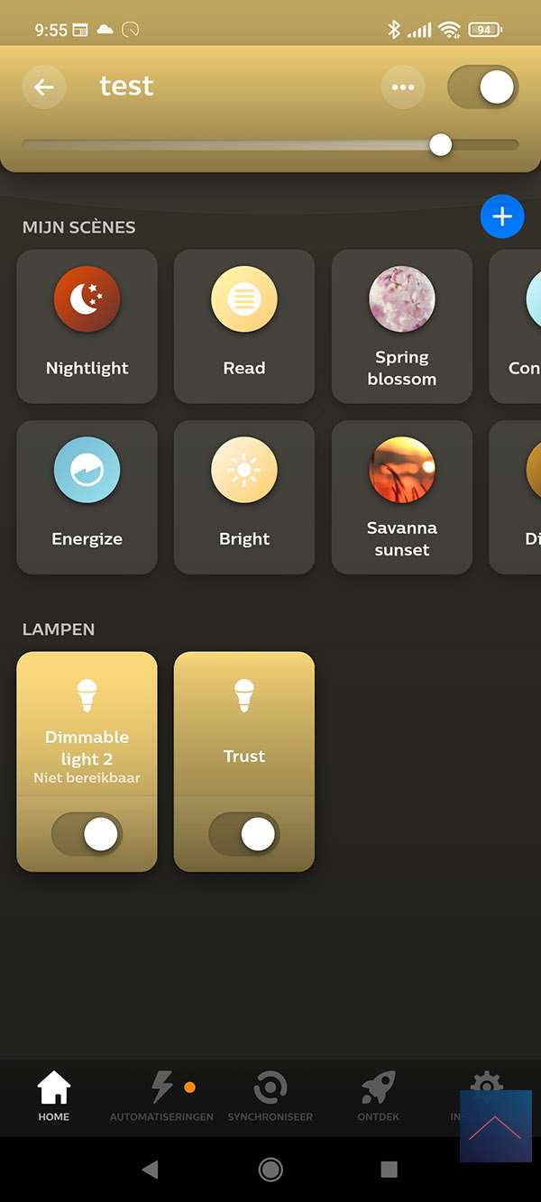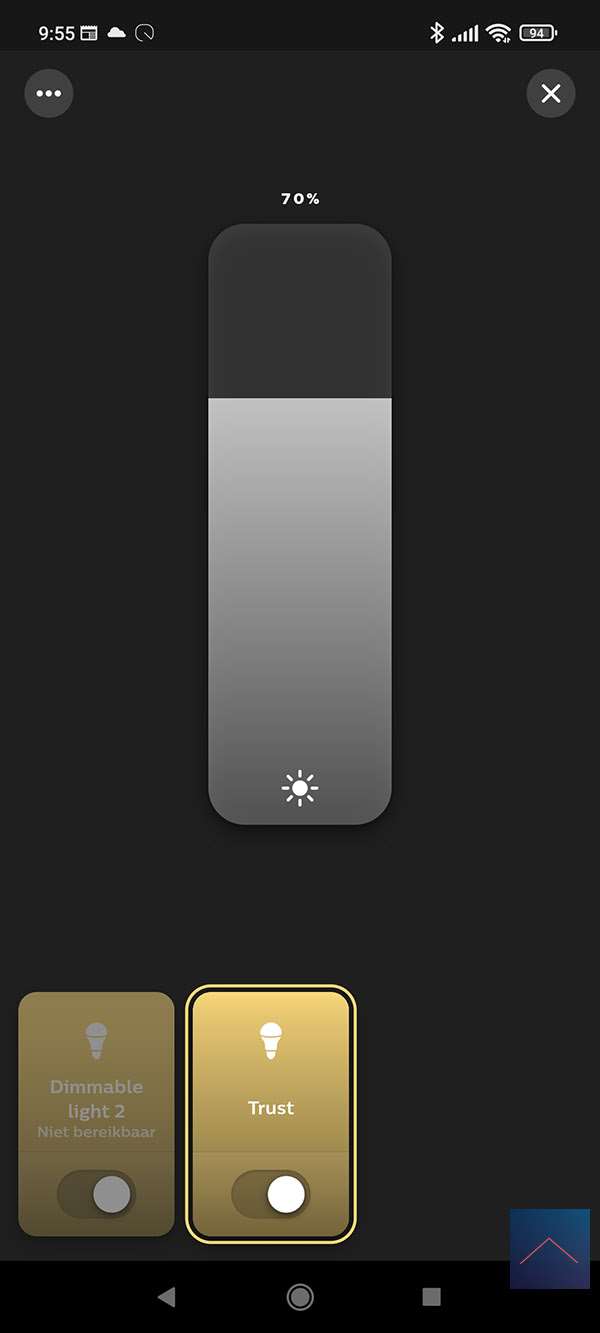 Ik voeg hem toe aan een kamer en zie dat ik een aan-/uit schakelaar krijg en het dimniveau kan bepalen.