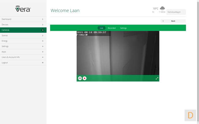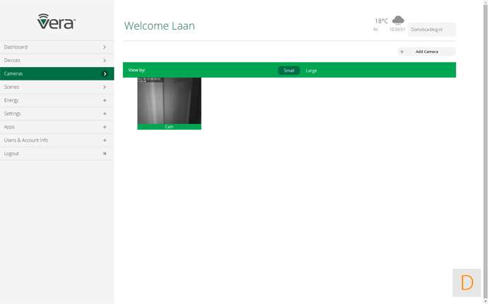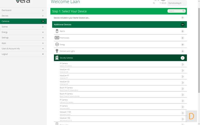 Via dit scherm kun je een camera aan je Vera koppelen. Het voordeel hiervan is dat deze ook via de APP bekeken kan worden. Je hoeft dus niet meer een aparte APP op te starten. Er is een WIKI pagina waar een lijst staat van camera's welke ondersteund worden: