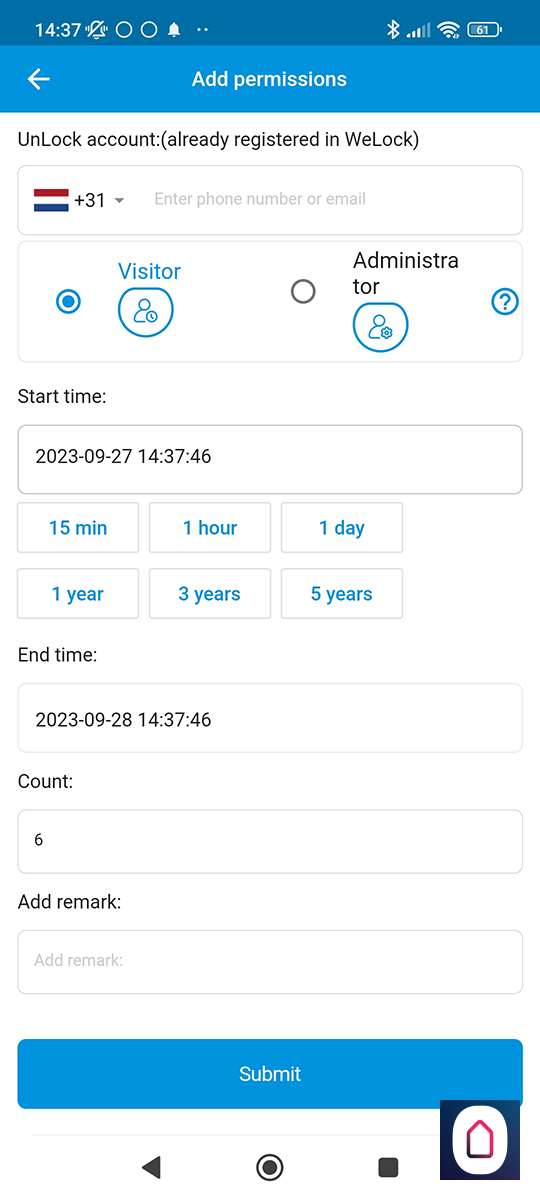 Via de APP kun je een gebruiker toevoegen welke via een sms wordt uitgenodigd zodat hij/zij het slot kan toevoegen. Je kunt tijdelijk even toegang geven (15 min tot in stappen naar maximaal 5 jaar) of via een start en eind datum. Je kunt tevens instellen hoe vaak iemand toegang mag hebben. Dus prima geregeld.