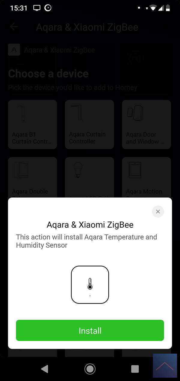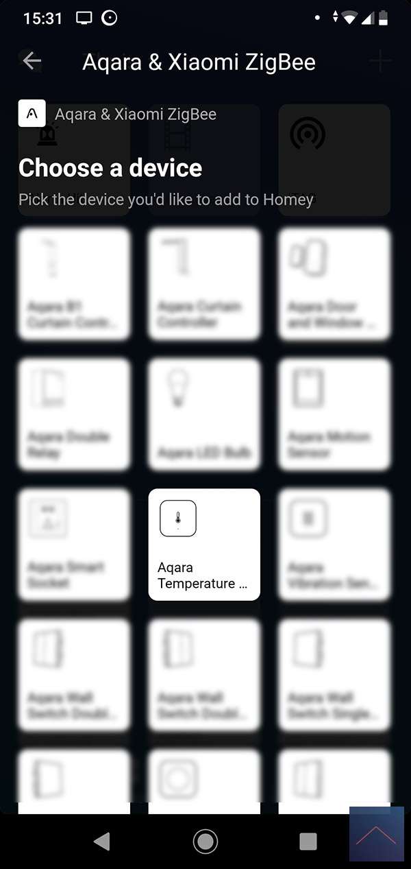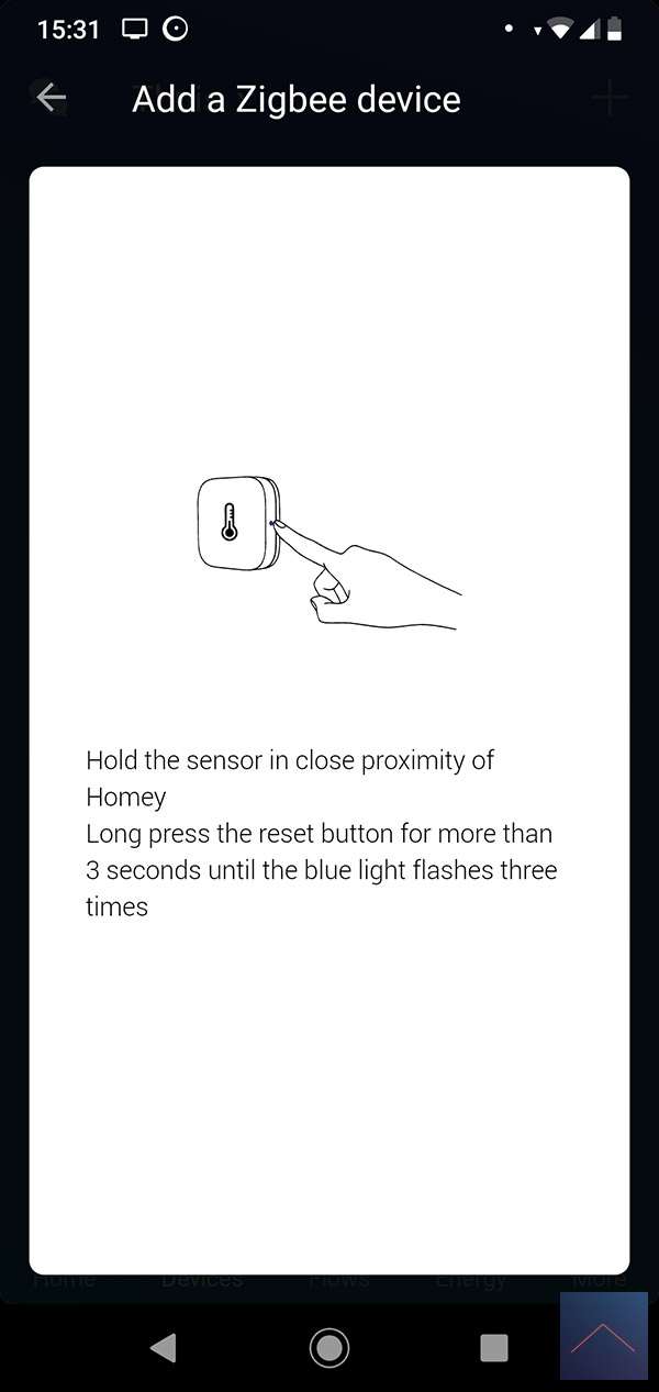 Deze sensor kan rechtstreeks aan de Homey worden toegevoegd je hebt dus de Gateway van Xiaomi niet nodig. Om hem toe te voegen log je in op de Homey en ga je naar je apparaten. Vervolgens klik je op het plusje en zoek je de Xiaomi temperature/humandity sensor op. Let op dat je de juiste pakt want er zijn 2 versies. Mocht je de APP niet hebben moet je deze even installeren. Om het toevoegen te starten druk je 5 seconden lang het knopje aan de voorkant in. Het LED zal blauw gaan knipperen. Ik zie de sensor verschijnen en zie de temperatuur, luchtvochtigheid en luchtdruk.