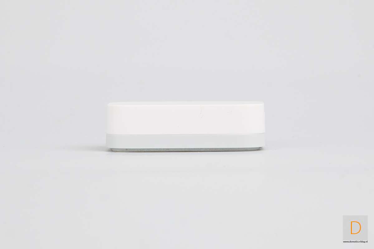 Aan de voorkant zit een klein ledje, welke gebruikt wordt voor het toevoegen. Aan de onderkant zit een knopje om hem toe te voegen aan de controller. Later hier meer over. Hij wordt geleverd met een dubbelzijdige sticker om hem op te hangen. Hij is niet op te hangen met een schroef.