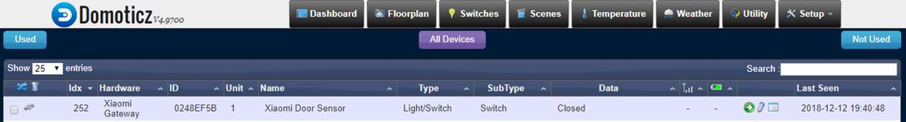 Als eerste voeg je de sensor toe aan de Xiaomi Gateway (zie hierboven). Hij zal hierna automatisch in Domoticz bij devices verschijnen en je hoeft verder niks te doen.
