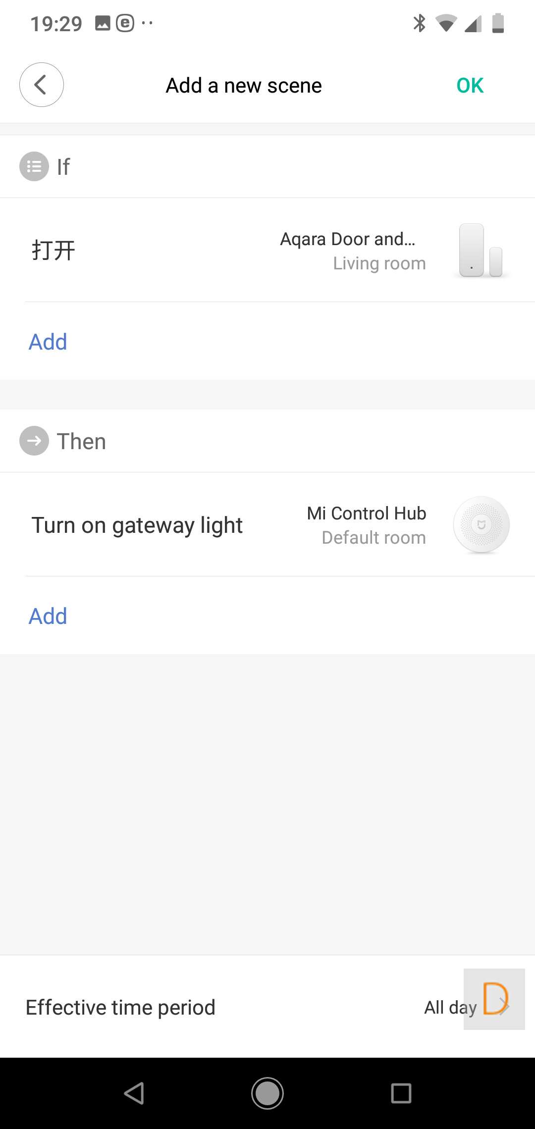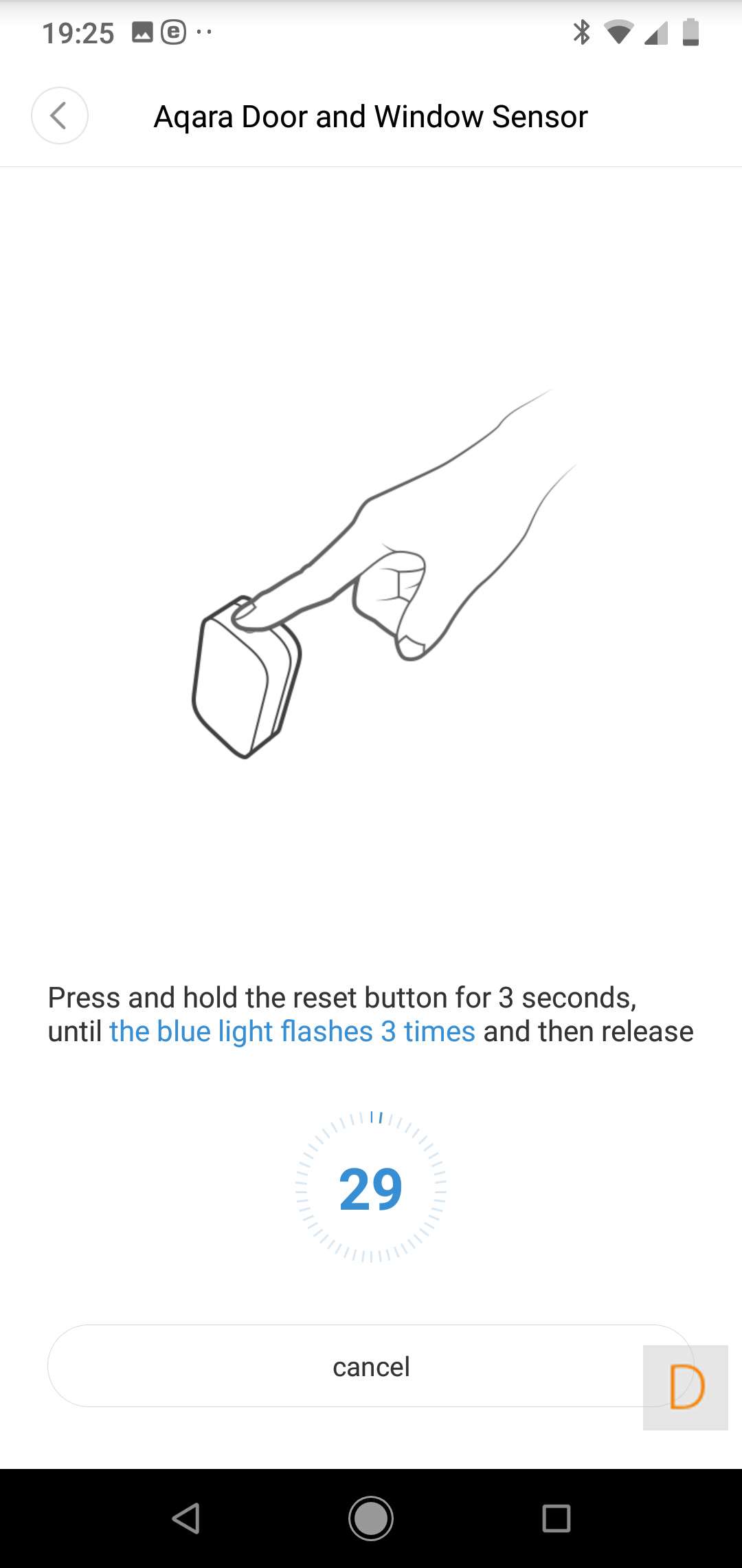 Om het toevoegen te starten druk je 3 seconden lang het knopje aan de onderkant in. Het LEDje gaat blauw knipperen als het toevoegen is gestart en de gateway geeft een mooie chinese tekst. Niet schrikken dus.