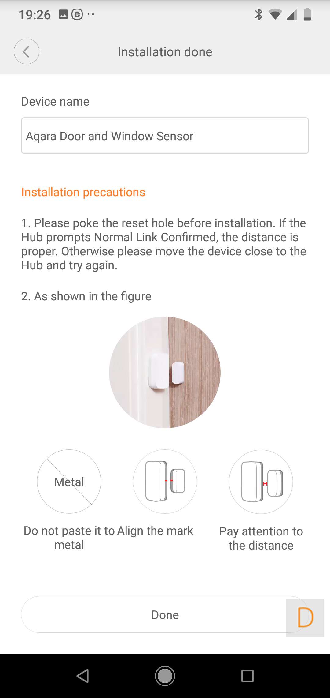 Hij werd uiteraard toegevoegd en ik zie de batterijstatus ook. Hij registreert goed, en snel, de open en sluiten status. Als tip wordt er nog gegeven dat na het plaatsen op de definitieve plek het knopje nog 1x in te drukken. Let er trouwens op dat je de streepjes aan de zijkant van de sensor en de magneet goed tegen over elkaar zet. Zorg er ook voordat er niet meer dan 3 mm ruimte tussen de magneet en de sensor zit.